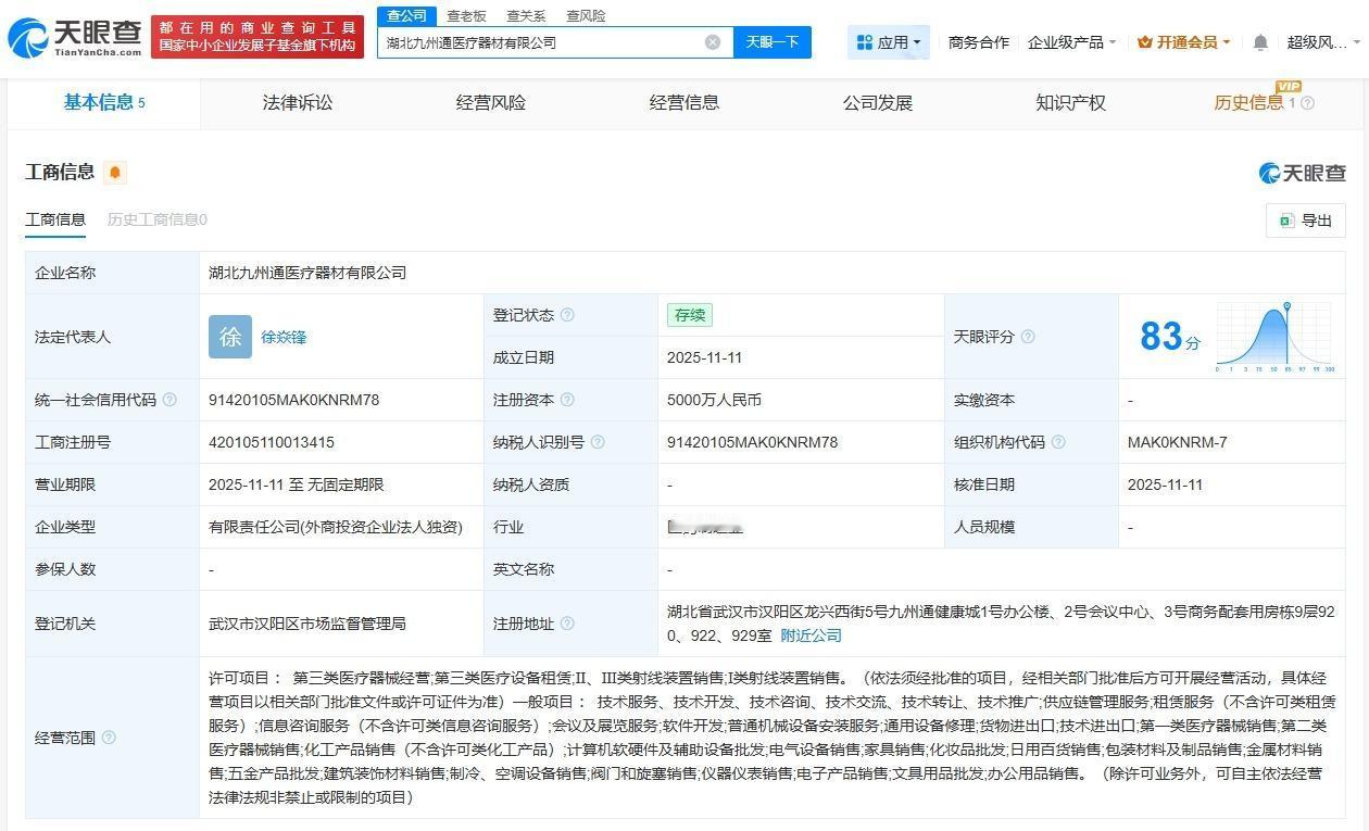 九州通在湖北成立医疗器材公司注册资本5000万 天眼查App显示,近日,湖北九州通医疗器材有限公司成立,法定代表人为徐焱锋,注册资本5000万人民币,经营范围包括供应链管理服务、第三类医疗器械经营、软件开发、计算机软硬件及辅助设备批发等。股东信息显示,该公司由九州通医疗器械集团有限公司全资持股。 天眼查信息: