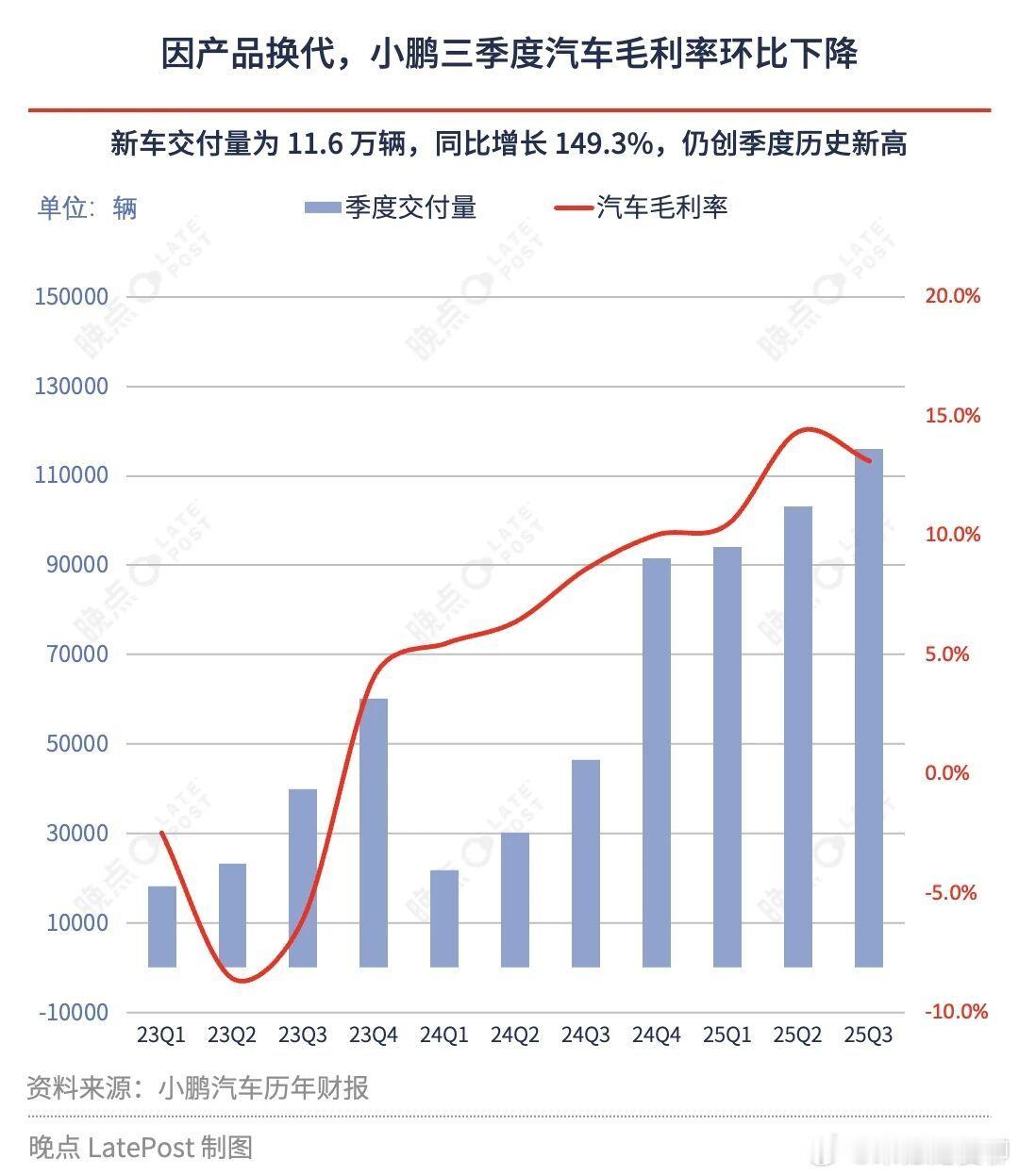 2025年Q3财报成为小鹏有史以来最亮眼的财报,已经接近盈亏平衡。 财报最大亮点是小鹏的综合毛利率超过20%,已然是业内第一梯队,甚至超过特斯拉Q3的18%。 亮点之外,也有短板。汽车业务的毛利率环比下降,单车的均价也环比下滑,侧面凸显了中国汽车市场的内卷,产品同质化严重,只能靠价格战。 又一次感慨,汽车真不是一门好生意。 但小鹏的底色其实很好,最不像汽车公司的车企,甚至这次的财报和小鹏科技日给人一种“不务正业”的感觉。 我打心底里认为,新势力就应该不务正业,因为正经造车市值的天花板是丰田,不务正业市值的天花板是特斯拉,所以新势力除了活下去之外,如何“不务正业”也是一个非常重要的课题。 况且何小鹏本身是科技行业出身的,造车是因为觉得很酷,但显然现在更酷的是造“机器人”。未来甚至可以考虑将小鹏汽车中的汽车去掉,不过这是比较久远的事情了。 想复制特斯拉的路径,首要任务还是要把车卖好,卖好车才能输血“不务正业”的业务。 Q4给的卖车指引没有很强的环比上升,中规中矩,能否真正盈亏平衡,还是要看技术服务费能带来多少收入,靠卖车是不行了。 好在的是,2026年算是小鹏的产品大年,总共规划了5款车: -G01 SUV 是一款大型6座SUV,会是X9的同款增程系统,不确定是否有纯电版 -G02 SUV 是一款全尺寸SUV,估计仍然会是增程 -F62 SUV 是一款紧凑级SUV 接下来两款会是2026年小鹏销量担当 -D02 Mona SUV 基于mona平台打造的中型SUV -D03 Mona SUV 基于mona平台打造的紧凑级SUV 整个Mona系列销量可能到3-4万,会成为小鹏的销量基石 今年小鹏算是平稳过渡,正常的更新换代,没有推出特别爆款的车型,而明年在10万的价格区间,有两款mona的SUV,很有可能复制M03的销量。在30万以上还有大型增程SUV,属于小鹏首次涉猎的市场,但这个区间厮杀已经非常激烈。