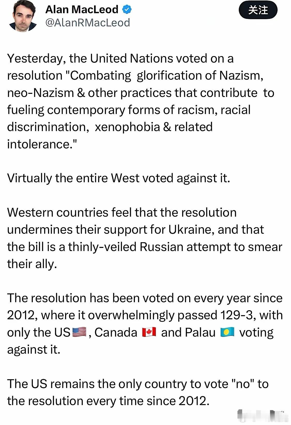 当地时间14 日,联合国大会再次高票通过了俄罗斯等30国提交的“反对美化纳粹主义”决议案。该决议以114票赞成、52票反对、11票弃权的结果获得通过。去年,美国也曾以“言论自由”为由反对类似决议。几乎整个西方国家都投了弃权和反对票。