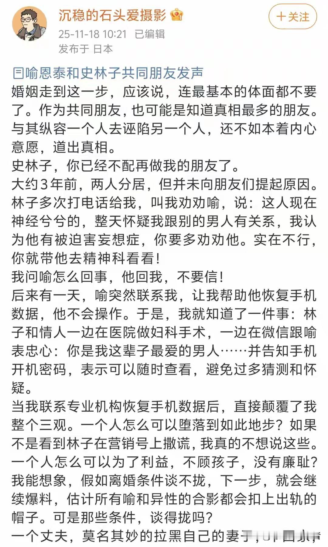 喻恩泰婚姻出现逆转,有好友曝光,喻恩泰妻子疑似婚内出轨,才导致了喻恩泰恩断义绝。 如今喻恩泰没有任何回应,感情是两个人的事儿。