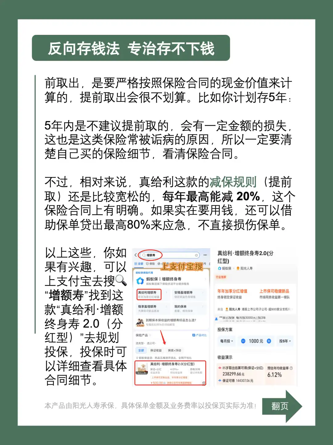 储蓄型保险和存钱还是有区别的,保险提前取出,是要严格按照保险合同的现金价值来计算的,可能会有一定金额的损失,所以一定要清楚自己买的保险细节,看清保险合同。不过,相对来说,这款真给利的减保规则还是比较宽松的,每年最高能减 20%。而且如果实在要用钱,保单还支持最高80%贷出,能很好应急,不直接损伤保单。