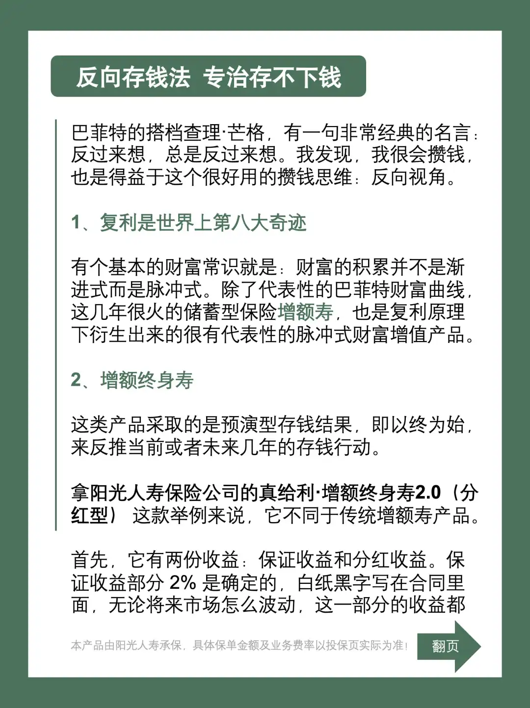 财富的积累并不是渐进式而是脉冲式,看巴菲特的财富曲线,他99%的财富都是在他50岁生日之后赚到的。这两年很火的储蓄型保险增额寿,也是很有代表性的脉冲式财富增值产品。