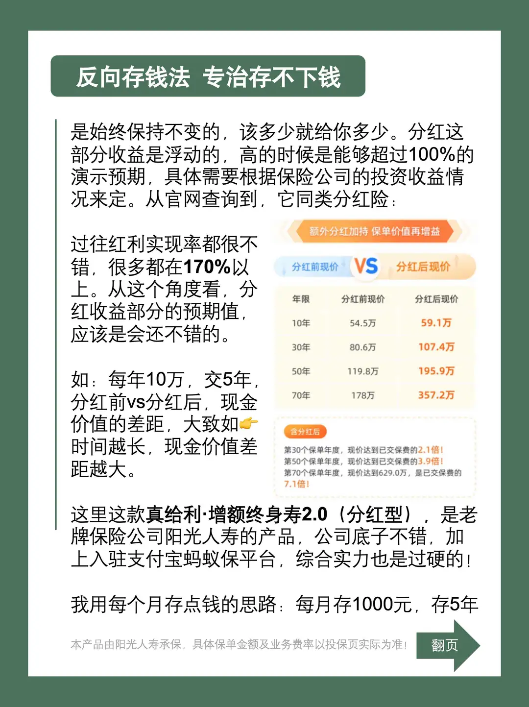以上,你如果有兴趣,可以上支付宝上搜“增额寿”找到这款“真给利·增额终身寿 2.0(分红型)”详细查看,有不清楚的地方也可以在线问,每月 500 就能起投,保单保障所见即所得。本产品由阳光人寿承保,具体保单金额及业务费率以投保页实际为准!