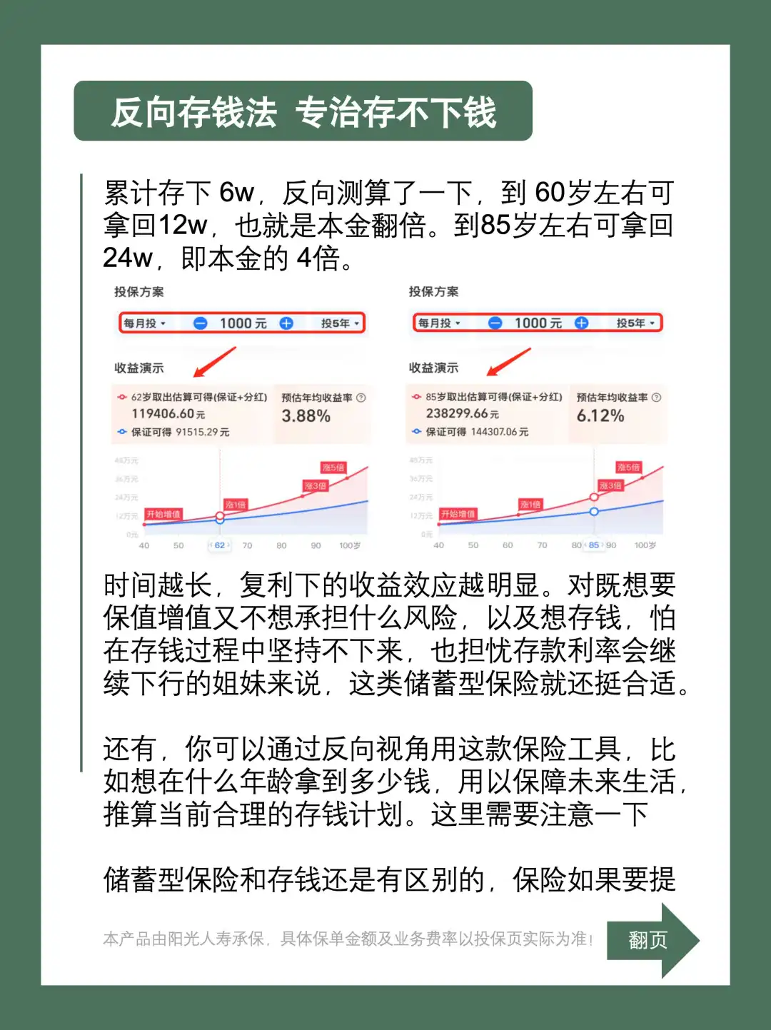 我用每个月存点钱的思路:每月存1000元,存5年,累计存下6w。反向测算了一下,到60岁左右可拿回12w,也就是本金翻倍。到85岁左右可拿回24w,即本金的4倍。时间越长,复利下的收益效应也会越明显。对既想要保值增值,又不想承担什么风险,以及想存钱,怕在存钱过程中坚持不下来,也担忧存款利率会继续下行的姐妹来说,这类储蓄型保险就还挺合适。还有,你可以用这款保险工具,通过反向视角,比如想在什么年龄拿到多少钱,用以保障未来生活,推算当前合理的存钱计划。从某种方面来说,也是攒另一种“养老金”。