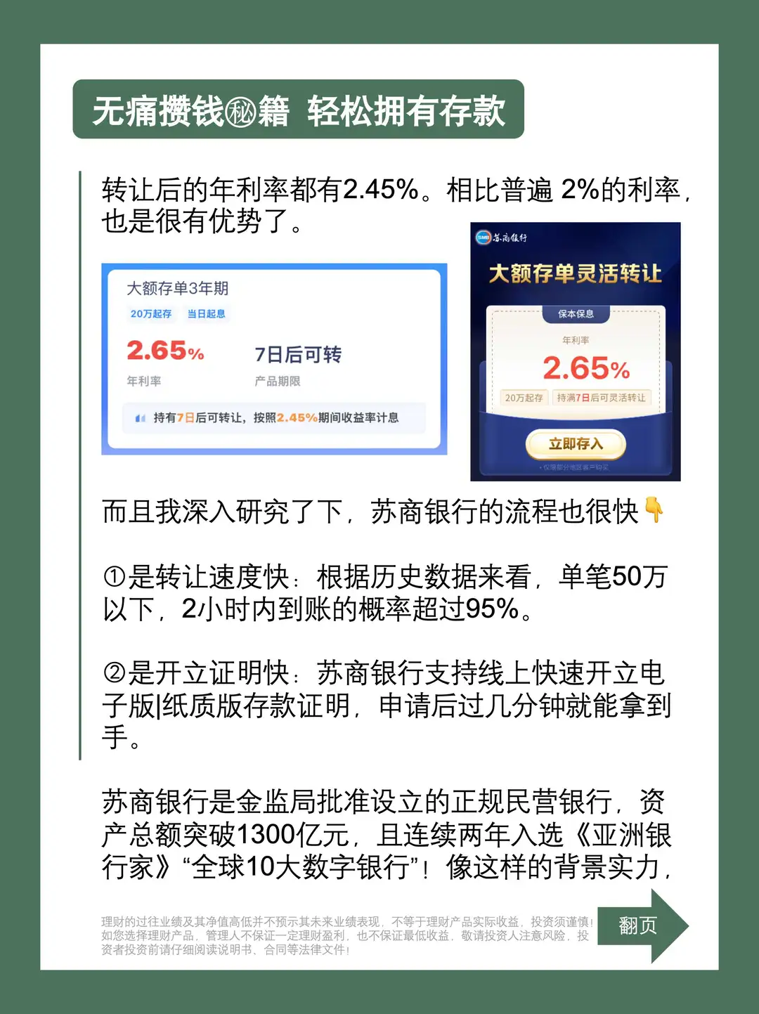 这几年银行存款利率降的厉害,但其实,存钱也是有信息差的。像大额存单这类,不仅比普通定期存款有较高的年利率,还很灵活,且有存款保险做保障,存大小银行是一样的。最近看到【苏商银行】三年期20万起存的大额存单,年利率2.65%、7天后可转让,转让后的年利率也有2.45%,相比普遍 2%的利率也是很有优势了。