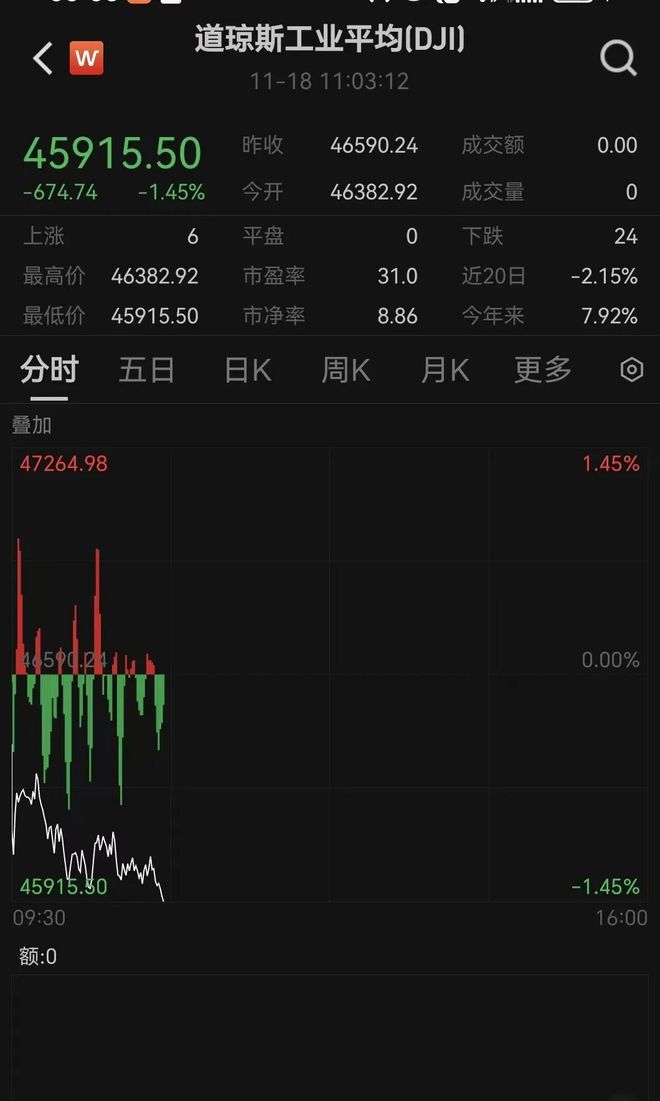 11月18日晚间,美股继续跳水,道指跌超670点,纳指跌超2%,标普500指数跌超1.4%。