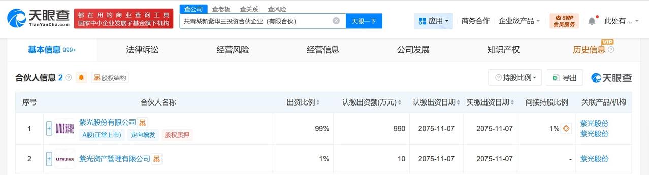出资额1000万 天眼查工商信息显示,近日,共青城新紫华三投资合伙企业(有限合伙)成立,执行事务合伙人为紫光资产管理有限公司,出资额1000万人民币,经营范围为以自有资金从事投资活动。合伙人信息显示,该合伙企业由紫光股份及旗下紫光资产管理有限公司共同出资。 天眼查信息: