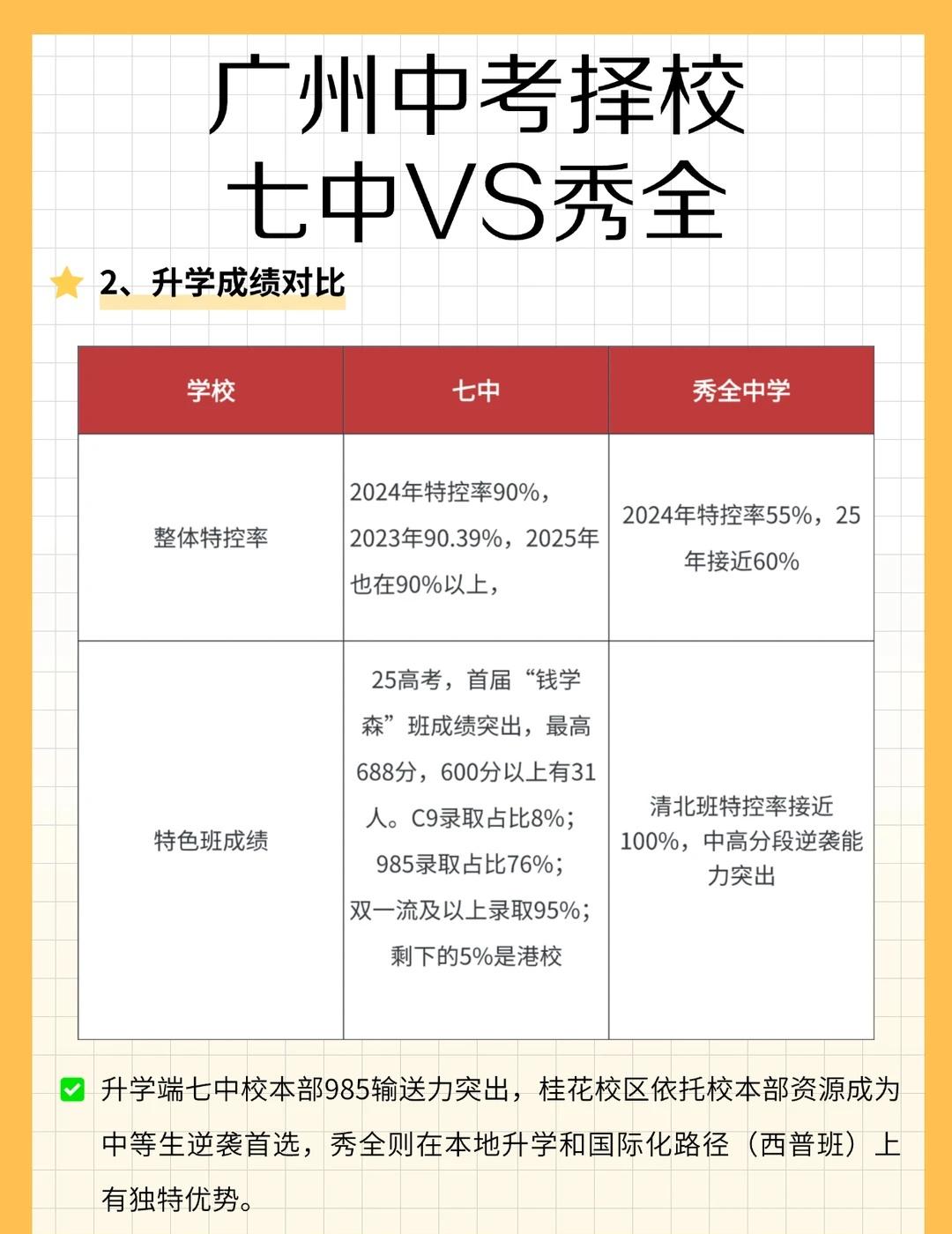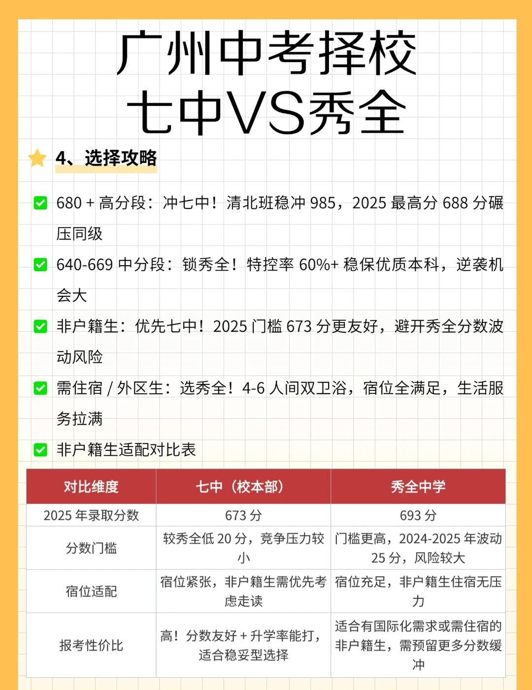 广州中考择校:七中VS秀全,哪个更适合你? 广州中考生家长必看!七中两校区(校本部+桂花校区),对比花都区秀全中学!全维度对比扒透,选校不纠结! 结论:高分冲七中校本部、中低分锁七中桂花校区、花都或需住宿 / 有国际化需求的学生选秀全,能实现分数与资源的最优匹配。 广州中考 择校 广州高中 中考志愿填报 学业规划 秀全中学 广州七中 升学 教育规划