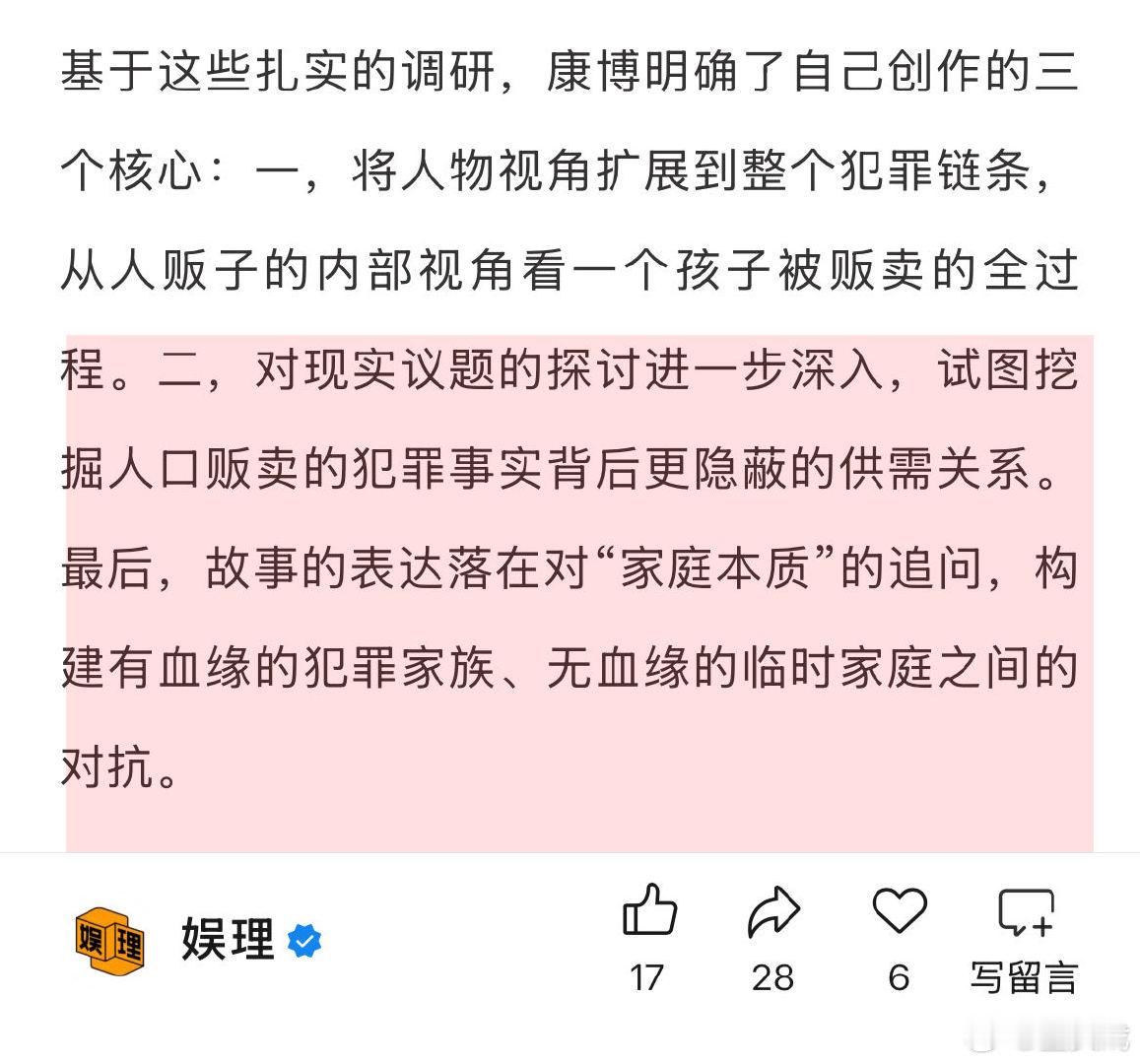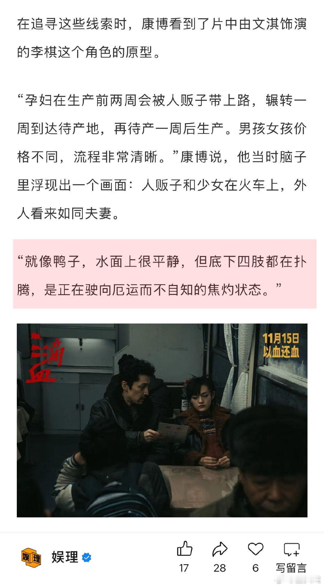在追寻创作线索时,《三滴血》导演康博看到了片中由文淇饰演的李棋角色原型。“孕妇在生产前两周会被人贩子带上路,辗转一周到达待产地,再待产一周后生产。男孩女孩价格不同,流程非常清晰。”康博说当时脑子里浮现出一个画面:人贩子和少女在火车上,外人看来如同夫妻…↓