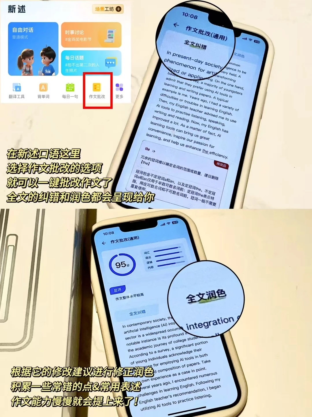 🥰练习完作文之后一定要记得及时批改修正。可以把你的作文发给新述口语APP,选择它的“作文批改”功能后将你的作文拍照提交给它。它会为你提供你全文的纠错,一定要看着它给你提供的错误点进行修正!同时也可以看一下它为你润色后的文章,让自己的文章慢慢写的更好~