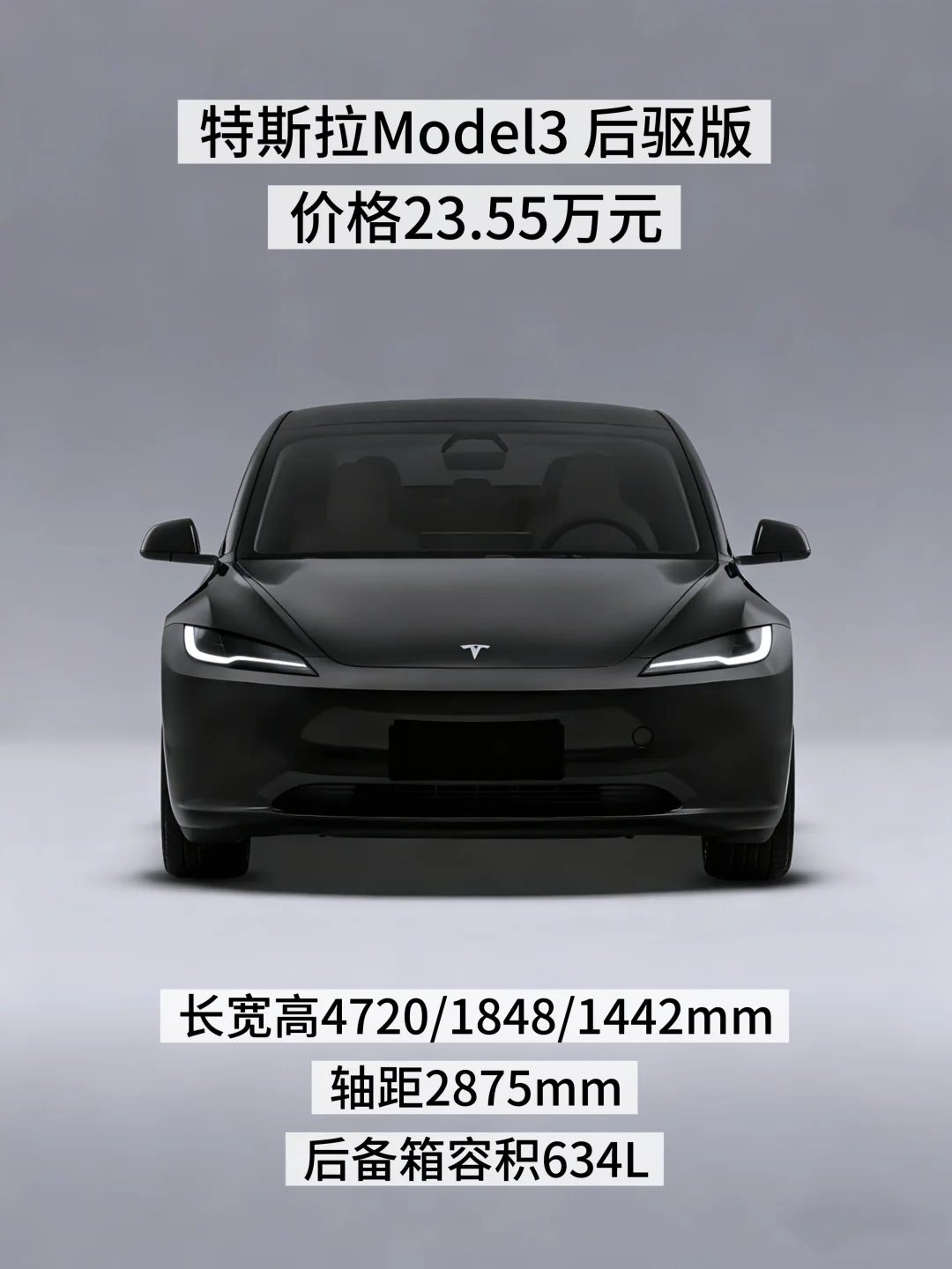 ✔️Model 3后驱版,价格23.55万元,长宽高4720/1848/1442mm,轴距2875mm。车内空间略小,后排比较局促。配置有点丐,仿皮座椅,前排加热、通风,没按摩,后排没通风。车子电控好,续航扎实,不虚标。智驾基础功能够用,但强的FSD要加钱,一般选配会比较少。