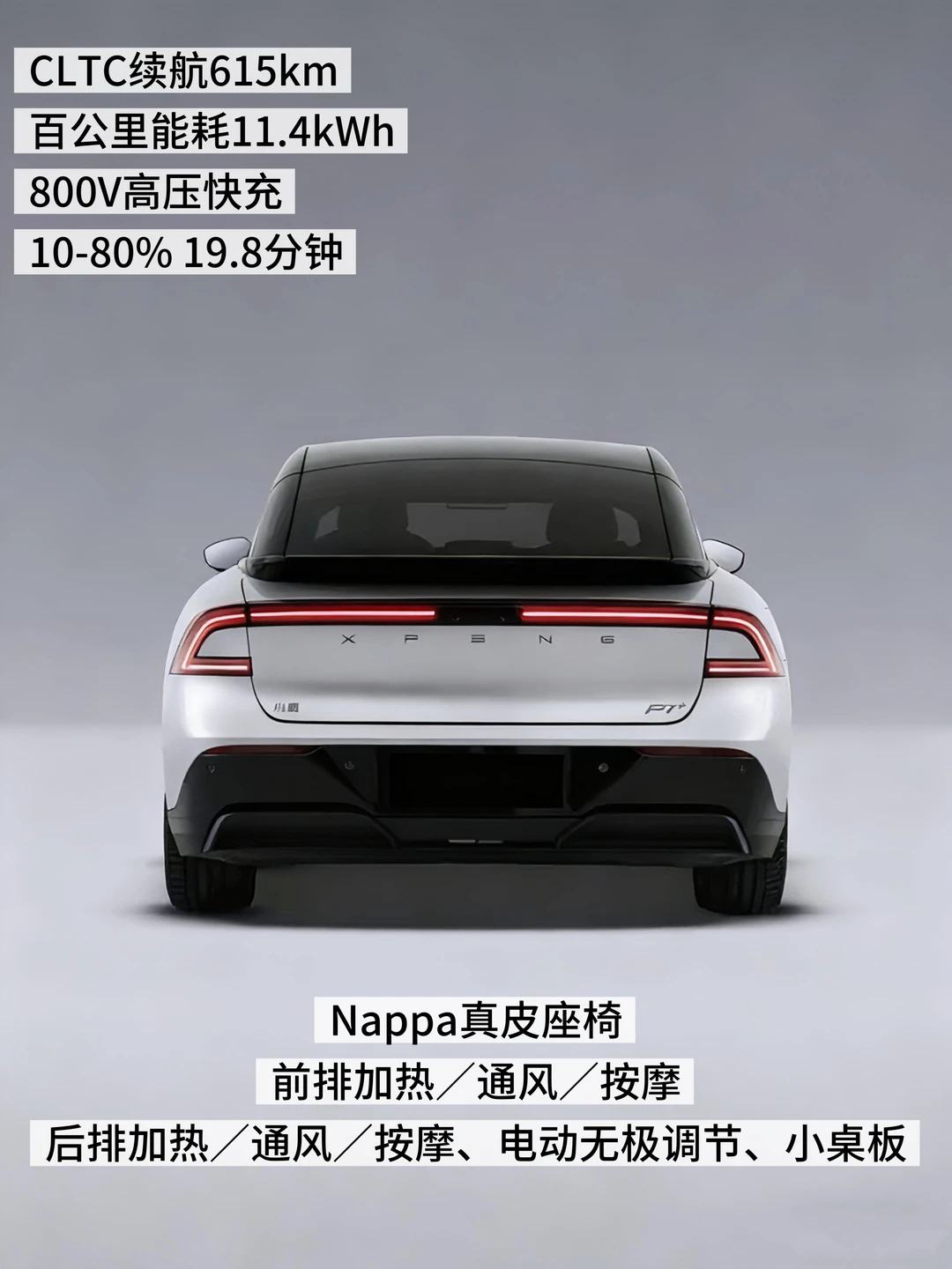 ✔️P7+长续航Max,价格18.68万,长宽高5056/1937/1512mm,轴距3000mm,车内空间宽敞,后排还有小桌板。 Nappa座椅,前后排加热/通风/按摩配置拉满。800V平台,充电从10-80%只要19分钟,还能外放电周末露营/烧烤两不误。智驾上面采用双Orin-X芯片+8295座舱芯片,支持高速+城区全场景模式,车位到车位,人机共驾,语音超丝滑。20万左右性价B之王,配置高,智能化体验好。
