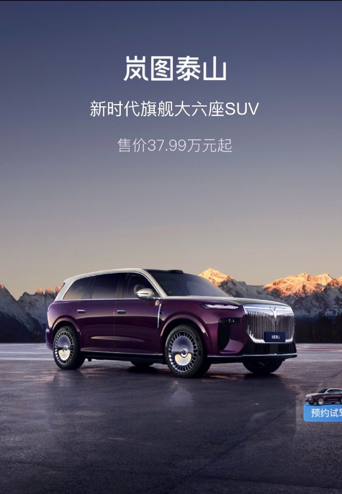上市的岚图泰山 它作为岚图的旗舰级大六座豪华SUV,核心卖点聚焦在高端底盘配置、华为加持的智驾座舱、超长续航以及越级舒适空间,具体车型特点如下: 1. 底盘操控属同级顶尖:它是国内首款量产三腔空悬车型,搭配EDC电磁减震,能毫秒级调节悬架刚度和高度,滤震和支撑性兼顾。再加上双向16°后轮转向,最小转弯半径仅5.4米,还支持蟹行模式,这台大型SUV在窄路调头、泊车时也很灵活。底盘核心部件用航空级铝合金,大幅降低簧下质量,提升操控响应。 2. 华为赋能智能拉满:智驾搭载华为乾昆ADS 4,配有4颗激光雷达在内的34颗感知硬件,能实现城市NCA、全场景泊车等全场景高阶辅助驾驶。座舱首搭鸿蒙座舱5 MoLA大模型,支持10屏联动,二排21.4英寸吸顶屏搭配32扬声器音响,还能通过HSpace-Link拓展生态,交互和娱乐体验都很出色。 3. 续航补能无后顾之忧:基于800V高压平台打造,搭载65kWh三元锂电池,CLTC纯电续航350km,综合续航超1400km,馈电油耗仅6.9L/100km。支持5C超充,20%-80%充电仅需12分钟,还有6kW对外放电和冬季续航提升设计,兼顾日常通勤、长途自驾和户外用电需求。 4. 空间舒适实现六座平权:车身轴距达3120mm,得房率86.8%,六座布局下三排座椅有175mm调节行程,还能向后30°电动调节,175cm成年人坐三排也不局促。二排零重力座椅带26个按摩点位和22向电动调节,三排也有通风加热,全车软质包覆率超90%,再加上电动车窗遮阳帘,舒适性拉满。 5. 外观奢华且仪式感足:采用家族鲲鹏展翼设计,超大镀铬直瀑式格栅搭配贯穿尾灯,还有劳斯莱斯同款大饼轮等设计,气场十足。高配的HUAWEI XPIXEL智慧投影大灯可投射导航和迎宾图案,半隐藏门把手带LED状态提示,搭配电动迎宾踏板,实用性和仪式感兼具。