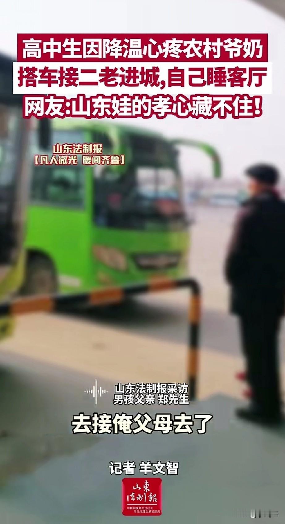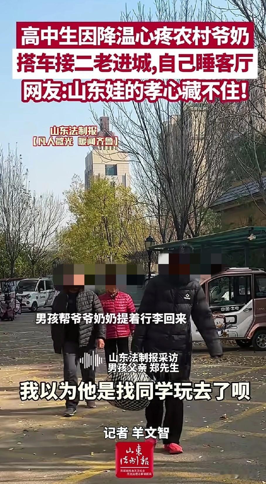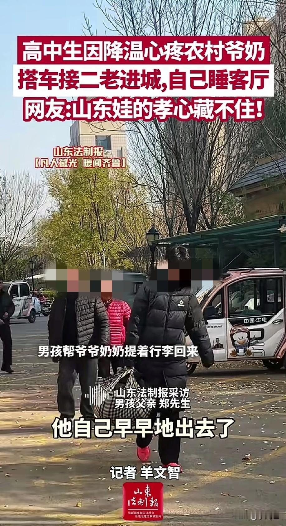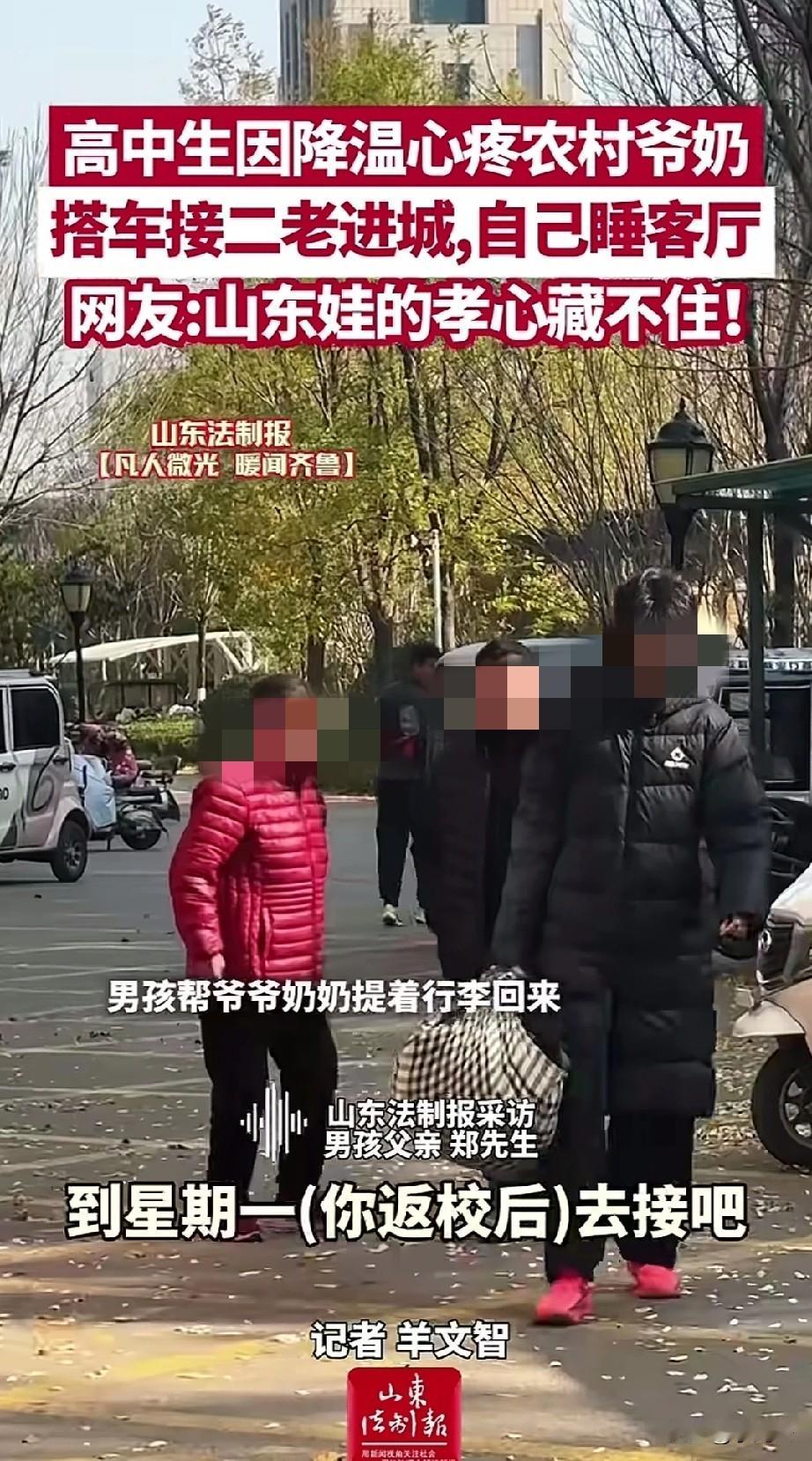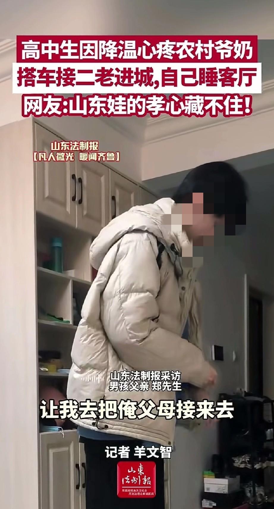 山东济宁一位父亲发布,高二的儿子放学回家后,觉得很冷,自己穿上羽绒服后。和父亲商量把爷爷奶奶接到城里来过冬,爸爸觉得来了也没地方住,还得在客厅打床,就说周一送完儿子后再接来。没想到儿子一声没说,第二天一大早坐公交折腾好几趟,把爷爷奶奶接来,腾出房间给爷奶住,自己却睡在客厅! 爷爷奶奶真没白疼这个大孙孙,山东济宁的高二学生小郑,周五放假回家后,对爸爸说周末就会大降温,咱把爷奶接到城里,这里有暖气不会冻着。 爸爸没当一回事,附和答应家里住不开,还得在客厅搭床,等周一把你送回学校后,房间空出来就去接。 不料第二天一大早,儿子也没叫爸爸开车,自己坐着公交车回去,帮爷奶收拾好东西就接到家里了。让爷爷奶奶住他房间,自己睡客厅。 父亲解释,孩子以为自己不愿意接,自己心疼爷爷奶奶,放心不下。第二天一早就坐着公交去了,当时也没想着是去接爷奶,等他回来的时候才知道。 看见他拉着爷奶的手,收拾好房间,很赞赏儿子的孝心,觉得比自己这个亲儿子还上心,爷爷奶奶没有白疼他。 其实爷爷奶奶在农村呆习惯了,有人说话有人串门,所以老人不愿意进城里来,觉得在城里生活不自在。 但是看见孙子来接,不想让孩子失望,成全孩子的孝心,才同意进城,打算住几天再回去。 一个有孝心的孩子,成绩好不好显得没有那么重要了,有这样的孩子会是一家子的骄傲吧!