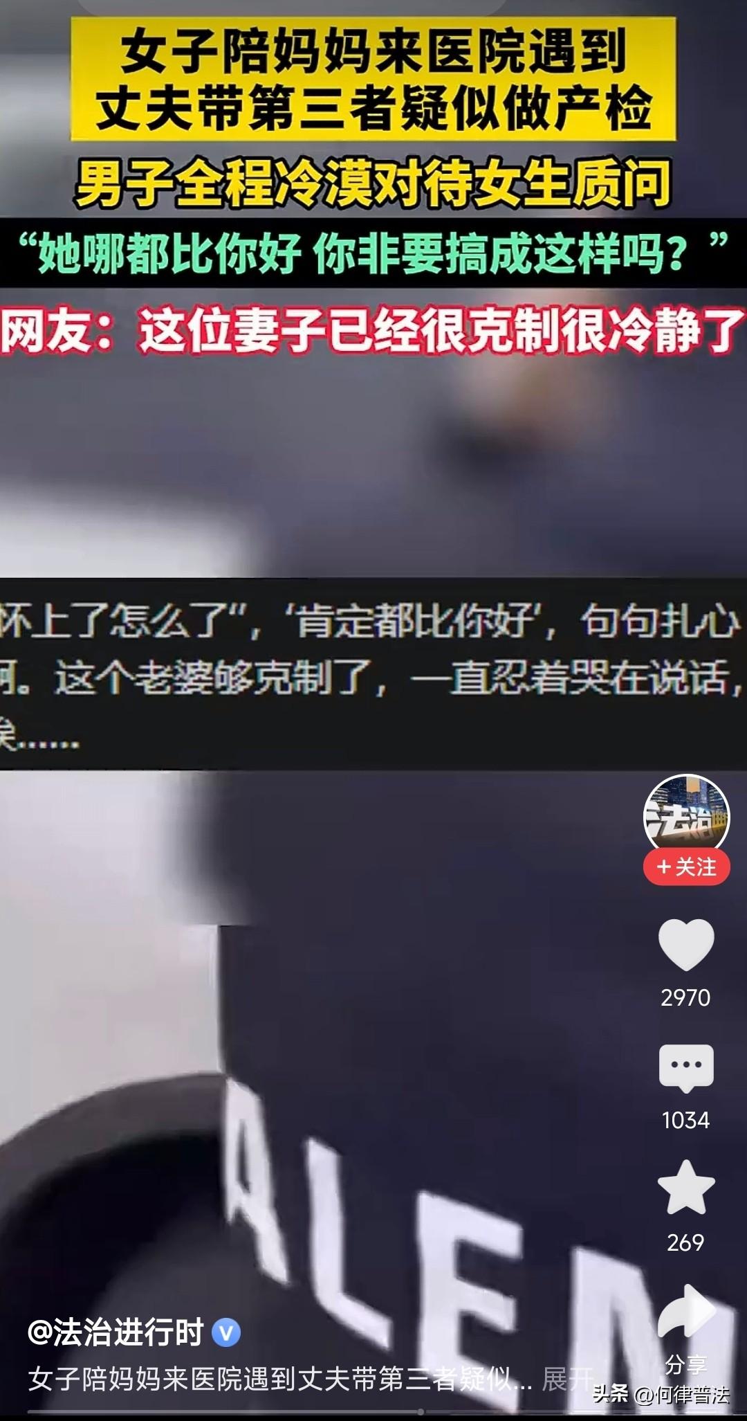 律所精英带乘务长产检被抓包!冷漠怼原配:她哪都比你好?法律可不惯着 11月11日医院里的那幕对峙,看得人牙根发酸——女子陪妈看病,转头撞见丈夫陪第三者做产检,男方非但不愧疚,反倒恶语相向:“她哪都比你好,你非要搞成这样吗?” 更让人咋舌的是,后续爆料称男方是上海君合律所的知名律师,第三者是上海航空乘务长,这身份配着这般做派,难怪网友怒喊“必须追责”! 男子疑带第三者产检被妻子偶遇 作为执业多年的律师,我先给大伙掰扯掰扯这事儿里的法律门道。首先得明确,单纯出轨虽不直接犯刑法,但绝非“没辙”。 根据《民法典》规定,夫妻有相互忠诚的义务,一方存在婚外情且有产检这样的实质过错证据,原配起诉离婚时可主张两项关键权利:一是要求过错方少分甚至不分夫妻共同财产,二是索要包括精神损害赔偿在内的损害赔偿 。 要是男方用夫妻共同财产给第三者买了房、车,原配还能起诉追回,这钱本就有你的一半,花给外人法律不认可。 更关键的是男方的律师身份。《律师法》第二条明确定义,律师必须恪守职业道德和执业纪律。君合这类顶尖律所,其行为准则必然强调“诚信正直”的核心价值观,类似 Clifford Chance 律所守则中“依规行事、承担责任”的要求 。 律师本是法律的践行者,却明知故犯违背婚姻忠诚义务,不仅砸自己招牌,更动摇公众对法律从业者的信任。若原配向当地律师协会投诉,查实后可依据《律师协会会员规则》给予警告、通报批评,情节严重的直接吊销执业证,此前就有律师因生活作风问题被吊销执照的先例。 再说说那位乘务长的职业约束。航空业对从业人员的品行要求严苛,婚恋作风混乱不仅违反企业内部纪律,还可能因“损害行业形象”被处分,严重的甚至会失去从业资格。 给原配提个实在的维权流程: 第一步,固定证据,医院监控、男方与第三者的聊天记录、产检单据等都要留存,注意取证方式合法,别碰侵犯隐私的红线; 第二步,向男方所在律所和律师协会提交投诉材料,同时可向航空公司反馈情况; 第三步,提起离婚诉讼,提交过错证据主张财产分割倾斜和损害赔偿。 若发现两人以夫妻名义同居,还可能构成重婚罪,可追究刑事责任,处二年以下有期徒刑或拘役 。 律师知法犯法,乘务长明知对方已婚仍介入,这样的“不简单”更该被严肃追责。婚姻里的背叛从不是“私事”,尤其对手握专业身份、本应守规矩的人来说,更该为自己的行为付出代价。 大伙觉得这事儿该怎么处理?原配的维权路该注意啥?评论区@何律普法 聊聊!