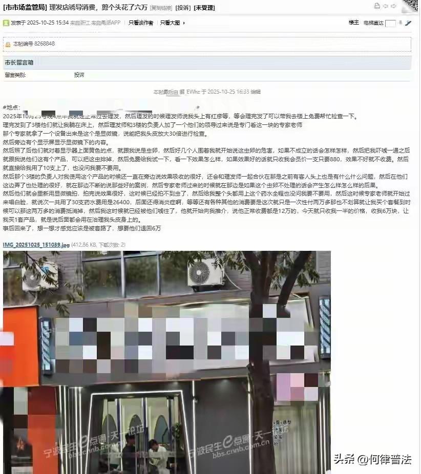 理发花6万?宁波这事戳破行业黑幕!律师教你3步维权,别吃哑巴亏 一颗老鼠屎坏了一锅粥!宁波这理发店真是把这句话演绎得淋漓尽致!普通理发变6万"除虫套餐",这套路深得能淹死人,作为打了十年消费维权官司的何律师,今天必须掰开揉碎了跟大伙说道说道。 你遇到过理发店诱导消费的情况吗 宁波市监回应网友理发一次花6万 事情得从10月24号说起,宁波这位网友本想踏踏实实理个发,结果理发师一句"你头上有红疹,免费给你查查",直接把人套进了坑里。理完发说查出了"虫卵",880元一支的药水咔咔用了30支,光药水费就2.6万,最后又忽悠着办了6万的套餐,说药水费能从中扣。 事后网友越想越不对劲:哪有虫卵能用30支药水瞬间除净的?这才反应过来被套路了,想要回6万块钱。目前宁波高新区市监局已经接了投诉,正在调查,但咱不能光等消息,得自己攥紧维权的主动权。 先说说这事儿里的3个法律硬伤,店家根本躲不掉: 第一,侵犯知情权和选择权。《消费者权益保护法》第八条明确规定,消费者有知悉商品或服务真实情况的权利。这药水啥成分、为啥这么贵、一次要用多少,店家压根没提前说明,上来就用,明摆着剥夺消费者的选择权 。 第二,涉嫌虚假宣传。要是最后查出根本没有虫卵,那就是典型的欺诈。根据《消费者权益保护法》第五十五条,欺诈行为要退一赔三,这6万不仅该退,还得额外赔偿18万 。 第三,可能触及非法行医。理发店根本没有诊疗资质,却声称能"治疗虫卵",要是用的药水属于药品,那就是妥妥的非法行医,严重的可能触犯刑法,可不是罚款能了事的。 网友评论里有人说"家里有矿才会付这么多",这话虽糙,但咱普通人遇上这种事,千万别慌,何律师给大家整理了3步维权流程,照着做准没错: 1. 固定证据别手软。把支付记录、和理发师的沟通记录、用剩的药水都保存好,最好再找店家补开收据,注明服务内容和费用。这些都是日后维权的关键砝码 。 2. 多渠道投诉施压。除了打12315找市监局,还能通过黑猫投诉、消费保这些平台投诉,要是感觉有胁迫,直接打110报警。更管用的是信访公众号,提交诉求后10个工作日左右就会有回应,机构会主动来协商。 3. 法律兜底不犹豫。要是店家拒不退款,拿着证据去法院起诉。像江苏昆山就有案例,老太被诱导充值3万,法院最终判店家退款,这种明显超出合理消费的大额充值,法院通常会支持消费者 。 说实话,这种"套路消费"不是第一次见,网友说"肯定不是第一次欺诈"绝非凭空猜测。这类黑店就赌消费者事后嫌麻烦不维权,咱偏不能让他们得逞。 现在市监局已经介入调查,咱就等着看结果。但更重要的是记牢:但凡遇到"免费检查""你身体有问题"这类说法,立马提高警惕;涉及大额消费,不管店家怎么吹,先跟家人商量;一旦感觉被套路,第一时间留证据、找渠道投诉。 最后,你们身边遇见过这种消费陷阱吗?要是店家耍赖,你们会怎么应对?评论区@何律普法 聊聊,互相支支招,别让更多人吃亏!觉得有用的赶紧转发给家人朋友,多个人知道就少个人上当。