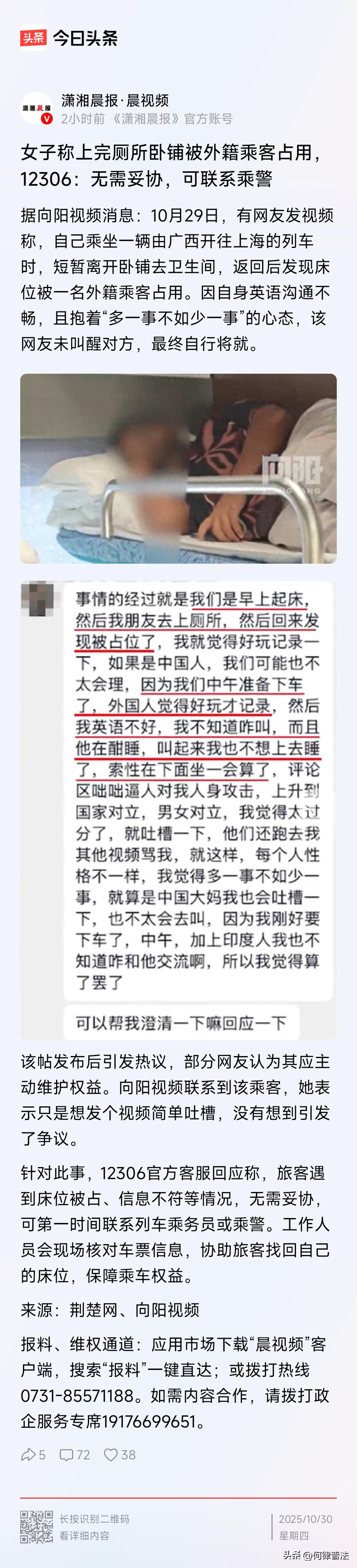 女子卧铺被外籍乘客占了就忍?12306硬气回应,法律早把“撑腰话”写明白了 刚刷到广西那位女士的视频,心里真挺不是滋味的。从广西开往上海的火车上,就去了趟卫生间的功夫,自己的卧铺居然被外籍乘客占了。她后来坦言,一是英语说不利索,二是想着“多一事不如少一事”,最后只能自己将就着熬过一路 。 女子被外国人占卧铺 12306:无需妥协 这事一发酵,网友们吵开了,有人说该争,有人心疼她的处境。好在12306很快给了准话:“无需妥协,找乘务员或乘警!” 作为干了十几年法律的何律师,今天就掏心窝子跟大伙说说,这事儿不光是“该不该争”,法律早就把“怎么争”“争得赢”的底气给咱备足了。 先把话撂明了:不管是哪国国籍,占别人的卧铺就是错,没任何含糊的。有网友说“中国人在自己地盘上不用怕”,这话在法律里有实实在在的依据。《铁路旅客运输规程》第二十条写得清楚,铁路得按车票上的时间、车次、铺位送旅客,咱旅客也得按票乘车,持低等级席位票占高等级的不行,占别人专属的卧铺更不行 。 而且这可不是铁路自己的规矩,上升到法律层面照样站得住脚。《治安管理处罚法》第二十三条明确规定,扰乱公共交通工具秩序的,能处警告或200元以下罚款,情节重的还能拘留。今年8月就有先例,深圳到武汉的列车上,外籍教授强占商务座,最后乘警依法把他带下车,还拉进了铁路黑名单 。这说明啥?规则面前真没人有特权,国籍从来不是“护身符”。 有人可能会犯愁:“我不会说外语,跟对方说不明白咋办?” 这压根不是问题。咱普通人没必要跟占座的人直接掰扯,铁路早给咱设计好维权路径了,三步就能解决: 1. 先留证据:掏出手机拍一下对方占铺的样子,再拍自己的车票信息和铺位号,万一后续有纠纷,这就是最直接的凭证 。 2. 快速求助:要么找车厢里的乘务员,要么扫“畅行码”线上反馈,系统10分钟内就会响应,列车长也得在5分钟内到现场 。不用自己费口舌,工作人员会核对双方车票,专业的人办专业的事。 3. 升级处理:要是对方不配合,直接要求联系乘警。乘警有权依法处置,真闹僵了还能联系外事部门,依据《出境入境管理法》限制他后续购票乘车 。 那位女士说的“多一事不如少一事”,我太懂这种心态了。出门在外谁都想图个清静,可有时候忍让真换不来体谅。你退一步,对方未必会感激,反而可能让更多人觉得“占座没成本”。2025年的数据显示,占座纠纷同比涨了23%,这跟部分人的忍让心态不无关系 。 咱中国人讲究和气,但和气得有底线。自己花了钱买的卧铺,凭啥要让给别人?再说了,铁路工作人员、乘警就是咱的后盾,12306都明说“无需妥协”了,咱更没必要委屈自己。有网友说得好:“中国人民早就站起来了,该维护的权益就得维护。” 最后给大伙提个醒:以后再遇到铺位被占的情况,别慌也别忍。记住“留证据、找 staff、叫乘警”这三招,法律和规则都站在咱这边。 你们有没有遇到过类似的事?当时是怎么处理的?要是碰到这种情况,你会主动维权吗?评论区聊聊@何律普法 ,让更多人知道该怎么守住自己的权益。