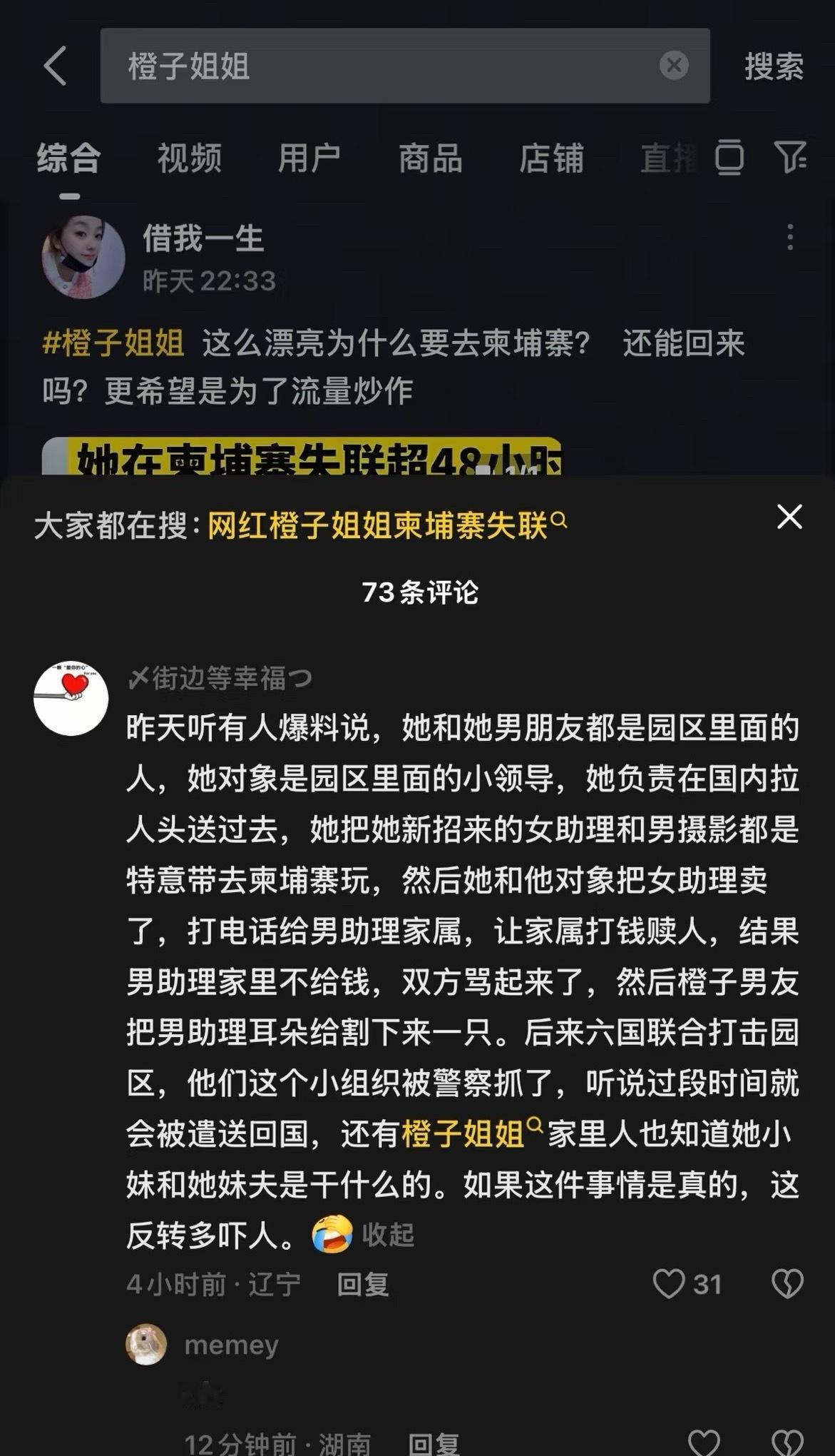 一开始刷到了橙子姐姐的失联信息还担心被骗到园区发生不好的事情,没想到是她骗别人。。。 网红橙子姐姐在柬埔寨涉诈被抓