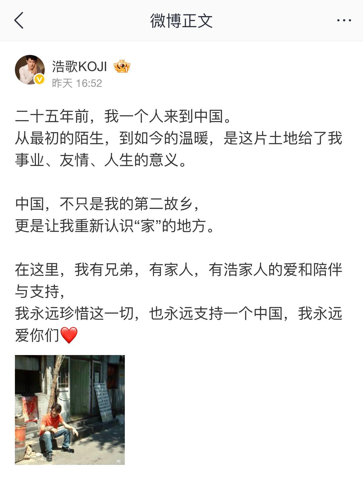 日本人矢野浩二发文表示,他永远支持一个中国,中国对于他而言不只是第二故乡,更是让他重新认识“家”的地方,他当初一个人来中国生活,由最初的陌生到如今的温暖,是这片土地给了他事业、友情和人生的意义,在这里,他有兄弟、家人、以及浩家人的关爱、陪伴与支持,他永远珍惜这一切,永远爱中国的朋友! 朋友来了有好酒,像浩二这样敢于正视历史,承认历史的日本朋友,我们随时欢迎。 可惜的是,这样的人在日本并不多见。