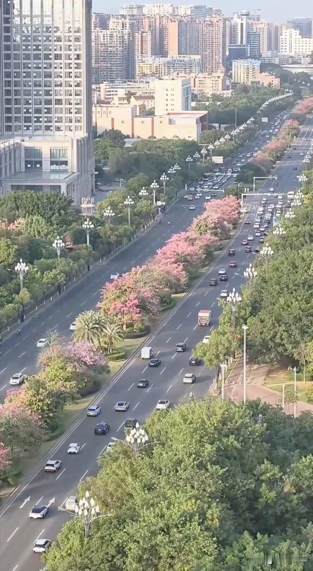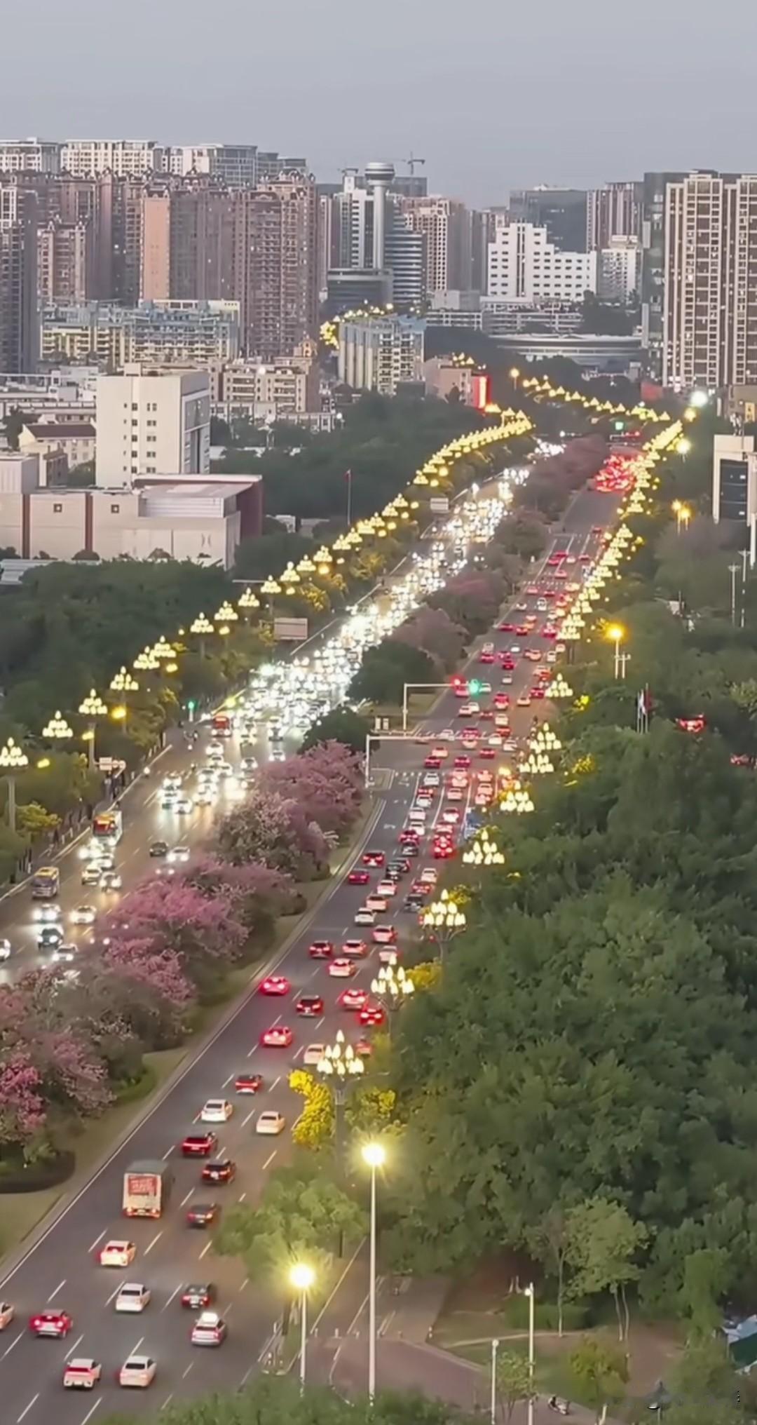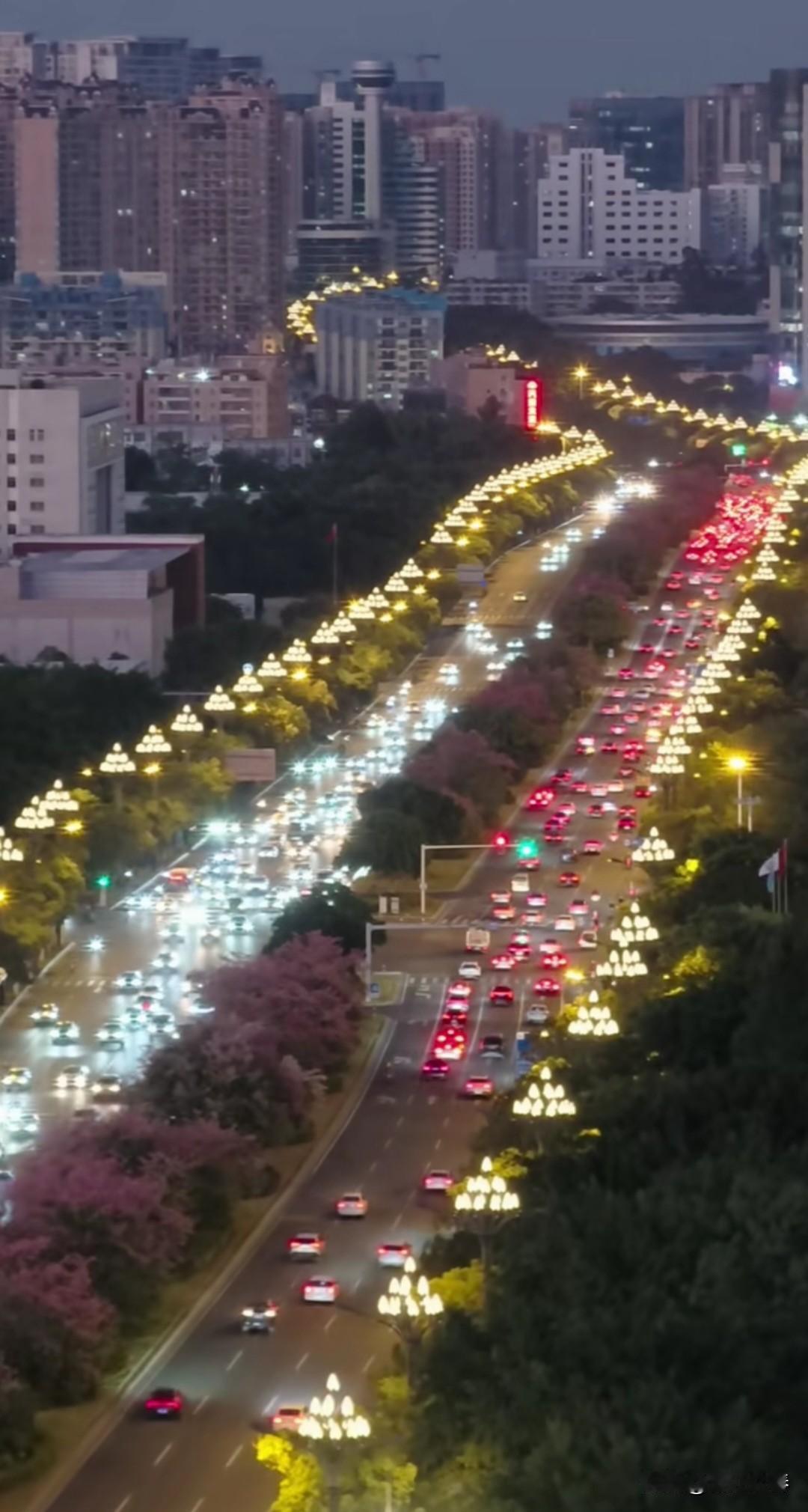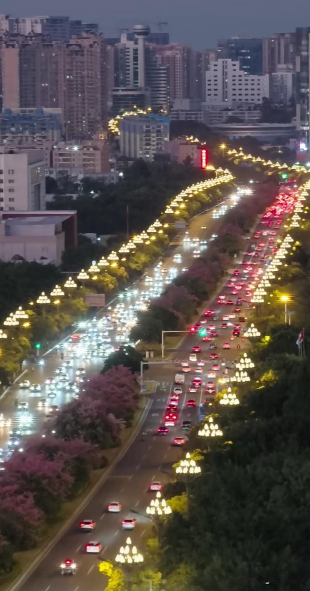 晋江世纪大道 冬日里的世纪大道,依然绿意盎然,一路繁花,异木棉灿烂绽放。 夜幕降临,华灯初上,街道上车水马龙。 霓虹灯盏隐悠悠,轻风浮影映宇楼。 马路两侧玉兰花路灯,宛如两条蜿蜒飞舞的火龙! 见证繁华盛世!