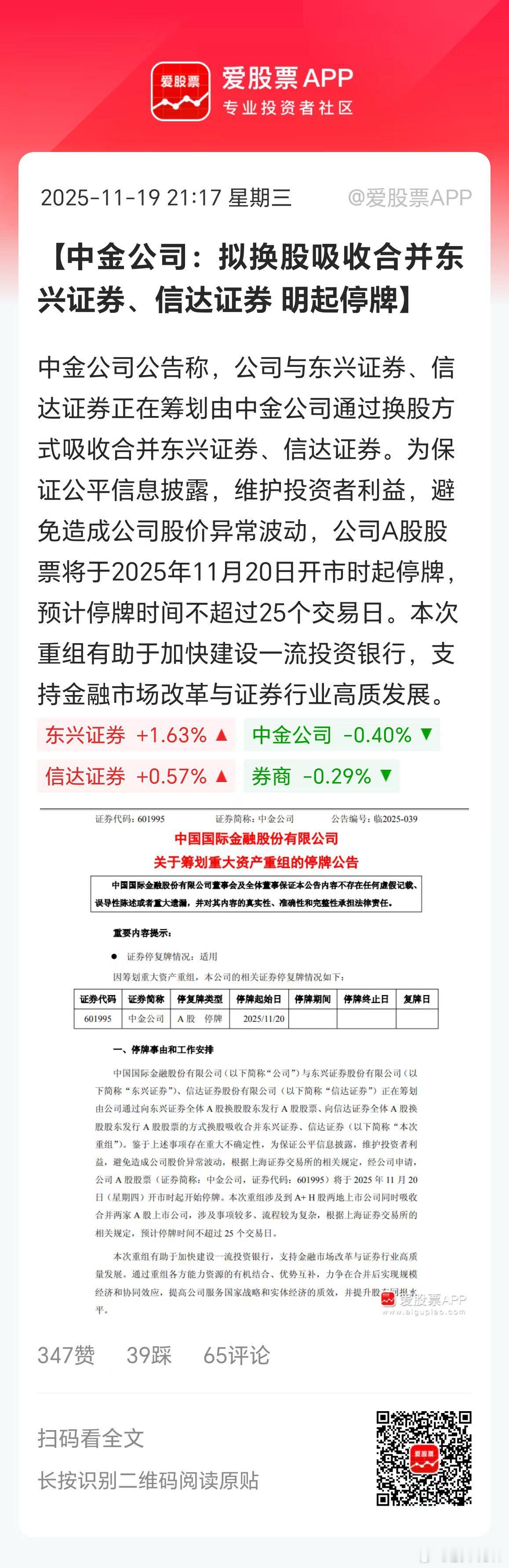券商来利好了,中金公司吸收合并东兴证券和信达证券,这是要打造券商航母的节奏啊!这次保密工作做的好啊,中金、信达股价还天天跌呢。不出意外,明天要拉一波券商了,会带动大盘直冲4000点么。作为牛市旗手的券商,已经横盘阴跌了3个月,每天被摁得死死的。但在A股低迷的当下,应该让券商起势一波,给市场打一剂强行针!国内上市券商确实太多了,合并一些也好,主要业务高度同质化。现在我们缺的是比肩高盛、大摩的券商航母,要想成为金融强国,就必须做强做大券商,这样才有更多的话语权啊。(爱股君)