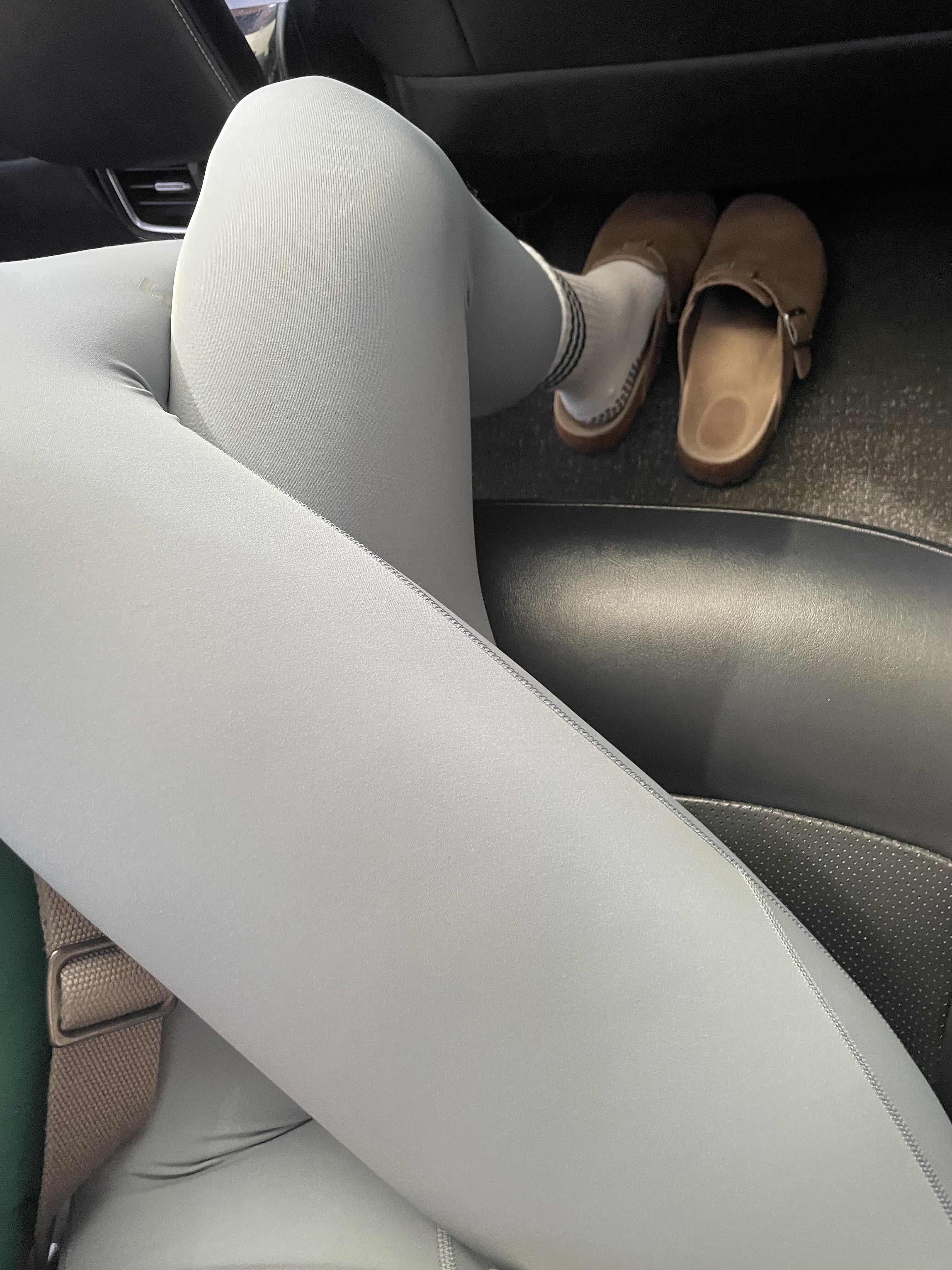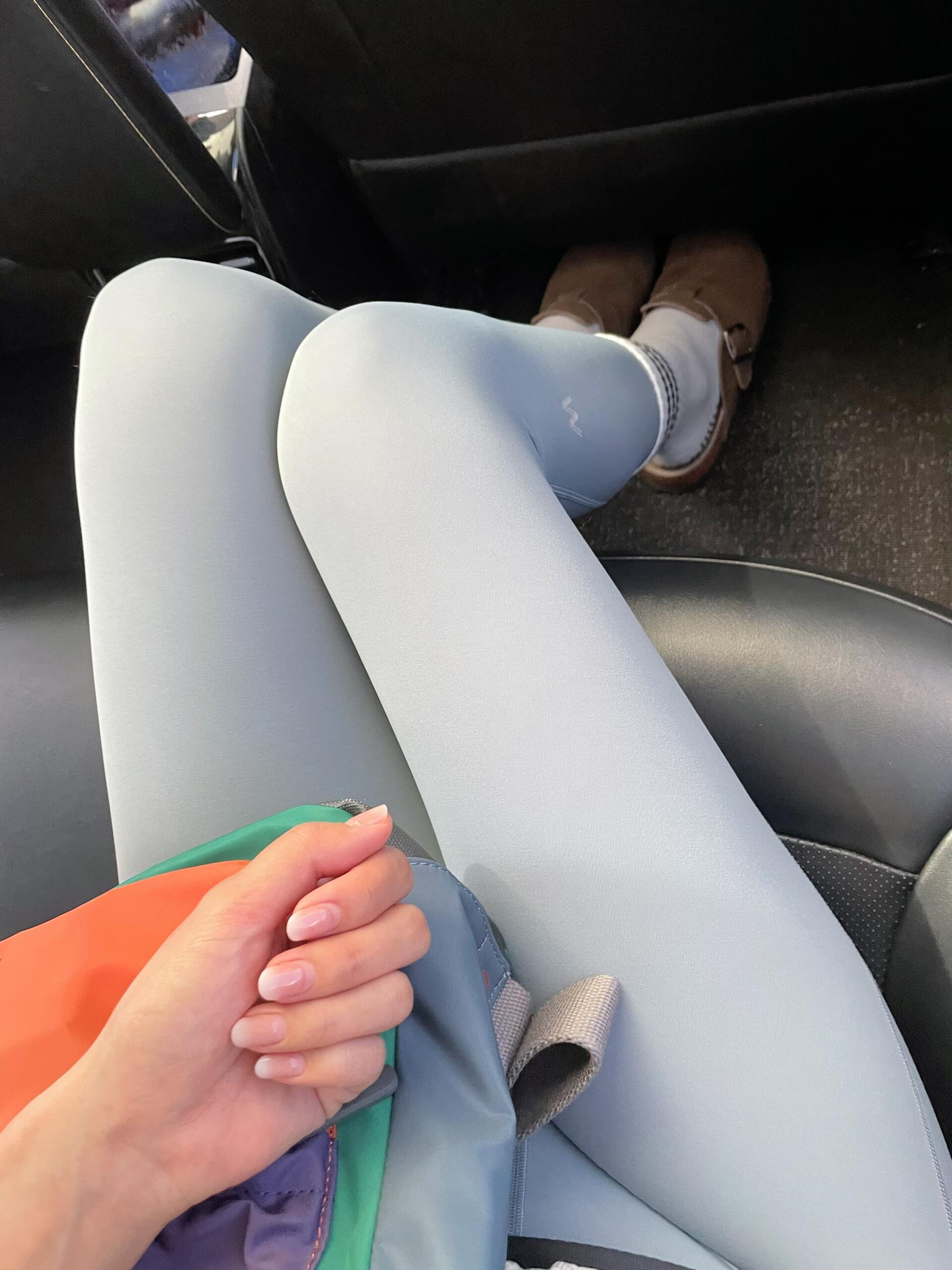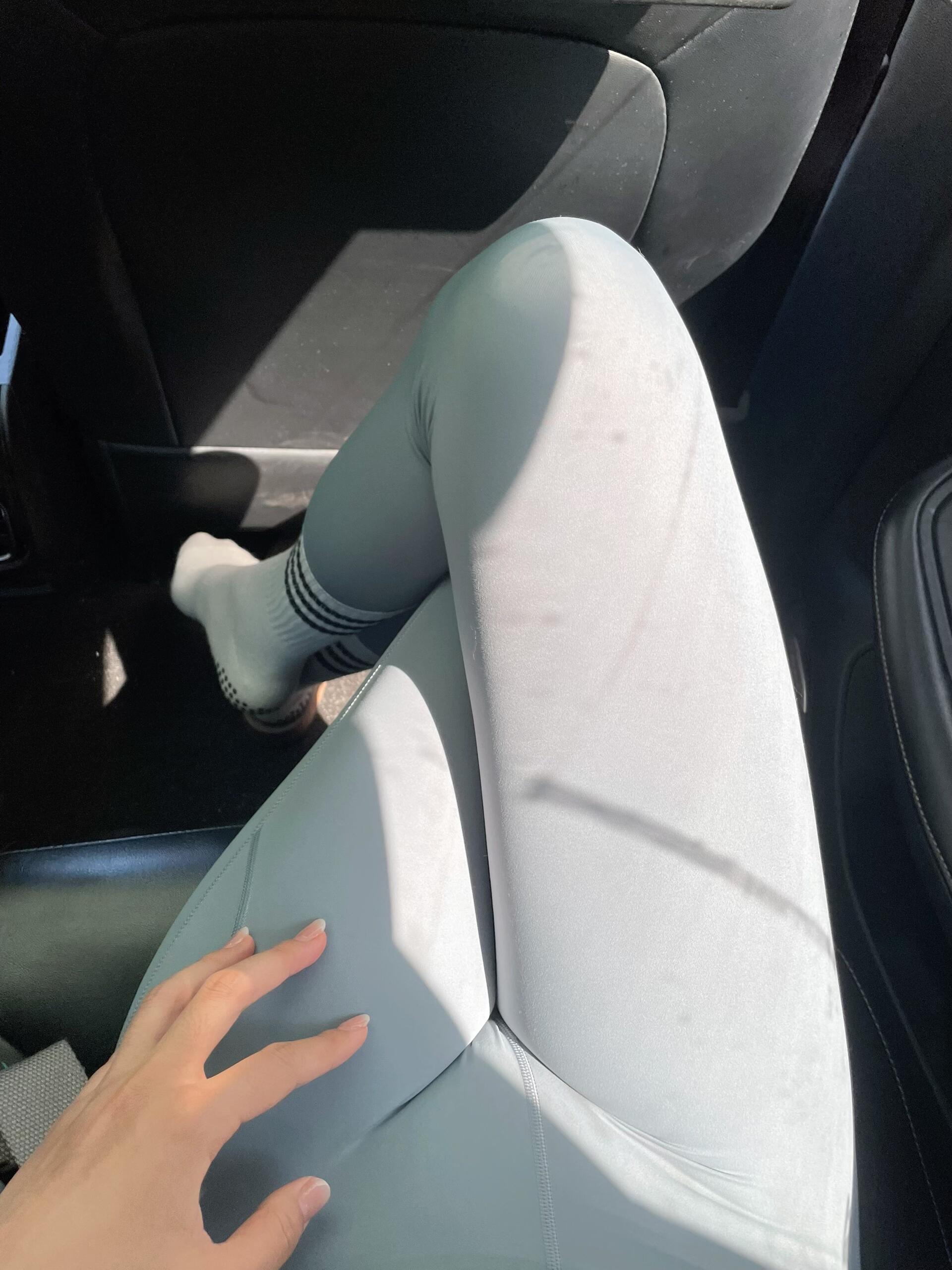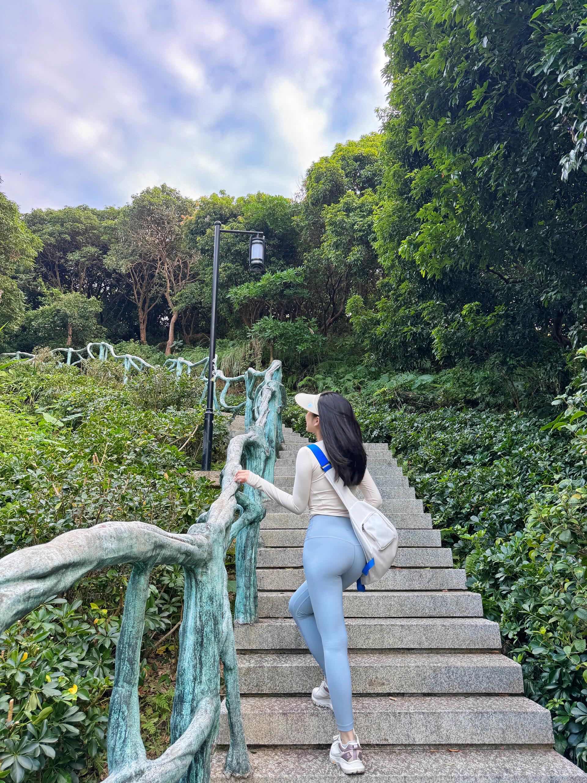户外山林的石阶上,她背着白色背包拾级而上,浅蓝瑜伽裤在绿意葱茏间格外吸睛,臀腿的紧致感与自然野趣碰撞,是都市人渴求的“运动系松弛感”;就连在室内、在车内,那抹蓝也毫不逊色——或伸直双腿展现修长感,或在座椅间勾勒出柔和曲线,哑光面料的高级质感与身材的完美契合,处处都是让有阅历的男士移不开眼的细节。