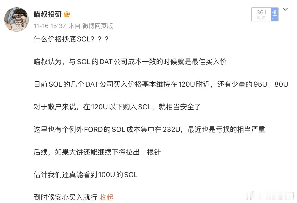 我对于SOL的底部价格判断非常正确(120挂单,接针到95、100、105)但是最近,有没有机会接到100U的SOL我也不知道而且从大饼插针到8万8,SOL居然还没有跌破120(插针也插不下去)确实硬DAT加持的代币虽然在后期可能会造成死亡螺线但是目前看,还算安全现在市场情绪已经接近极度恐慌,后续就算真的来了超级大熊SOL最多也就跌到50U附近(23年的筹码密集区),对于我的挂单价格也就腰斩,个人可以接受兄弟们,在购入山寨之前,先思考最坏的结果如果你认为腰斩以后你就会无限焦虑,看不到未来我建议你去玩QQQ如果你想吃到更高的收益,并且心态很好那么币圈市值前十才是属于你的标的