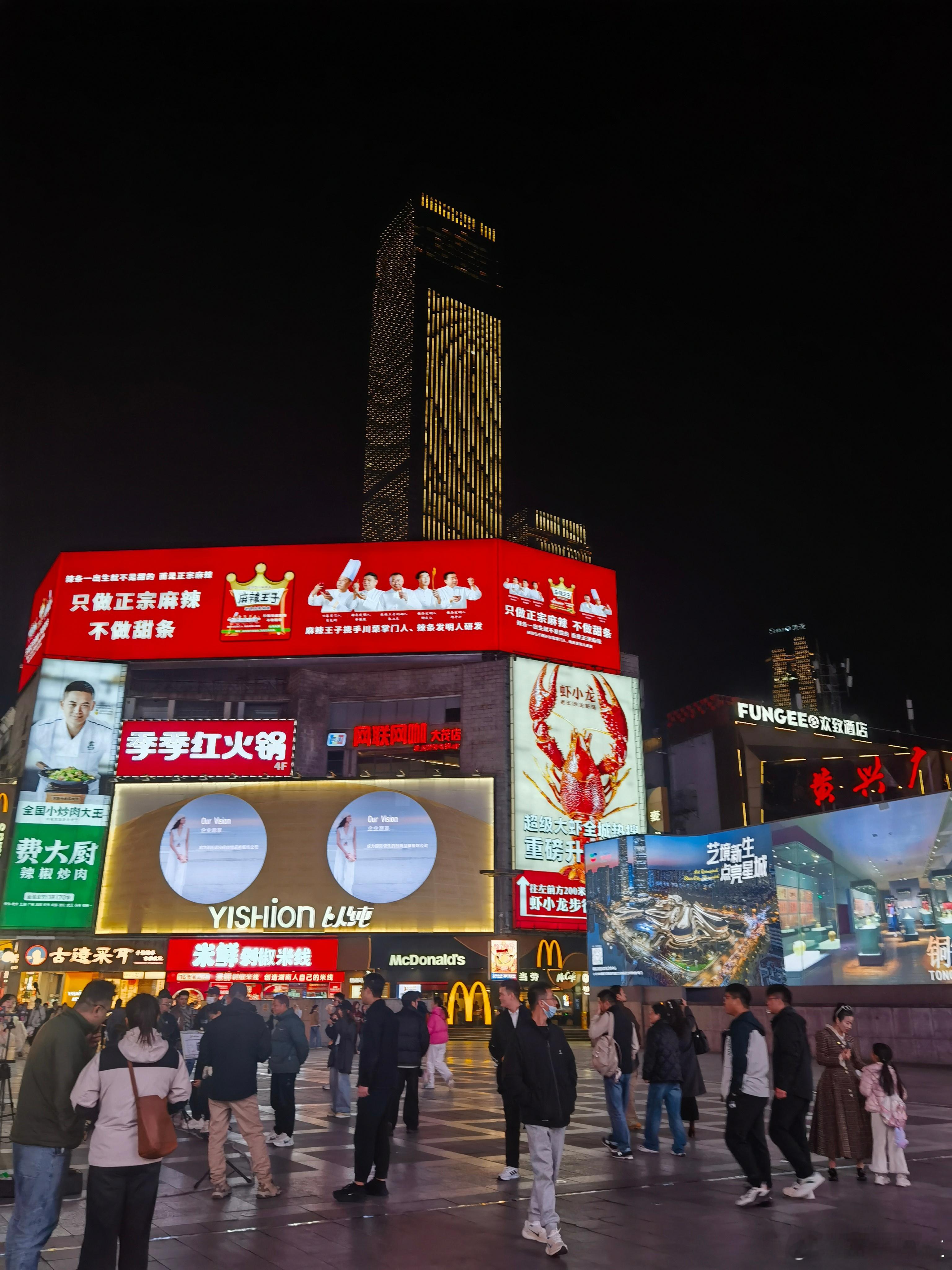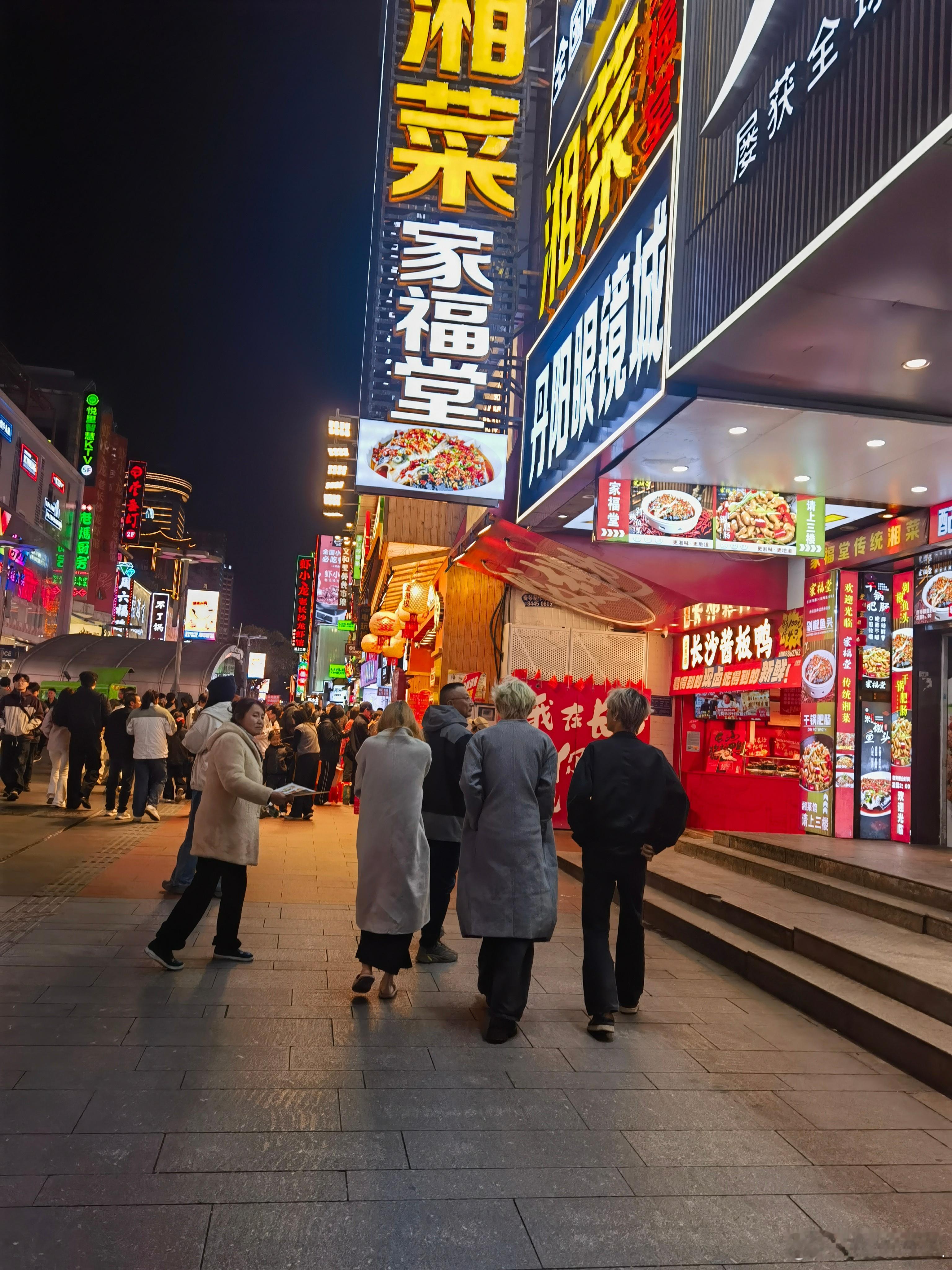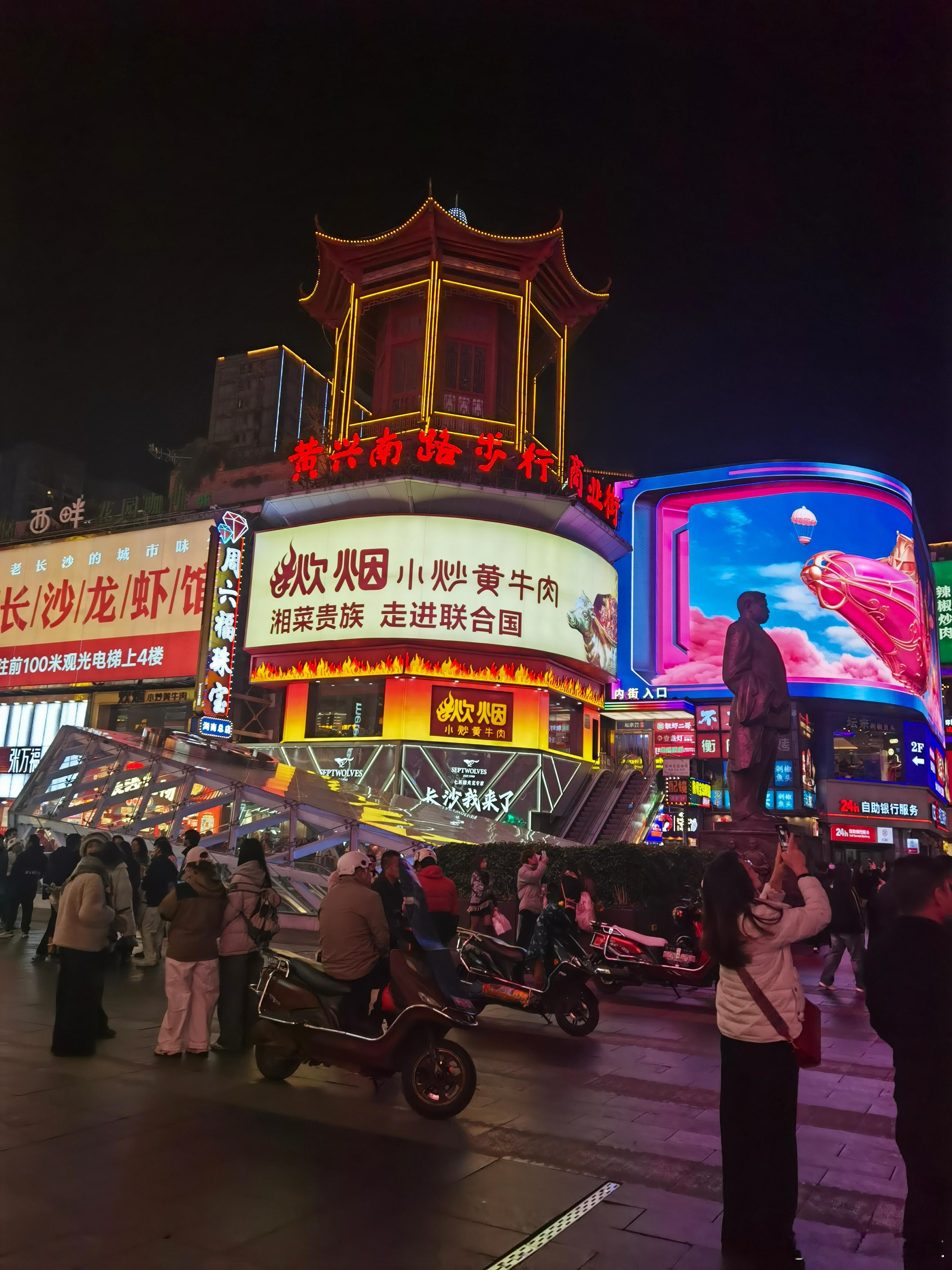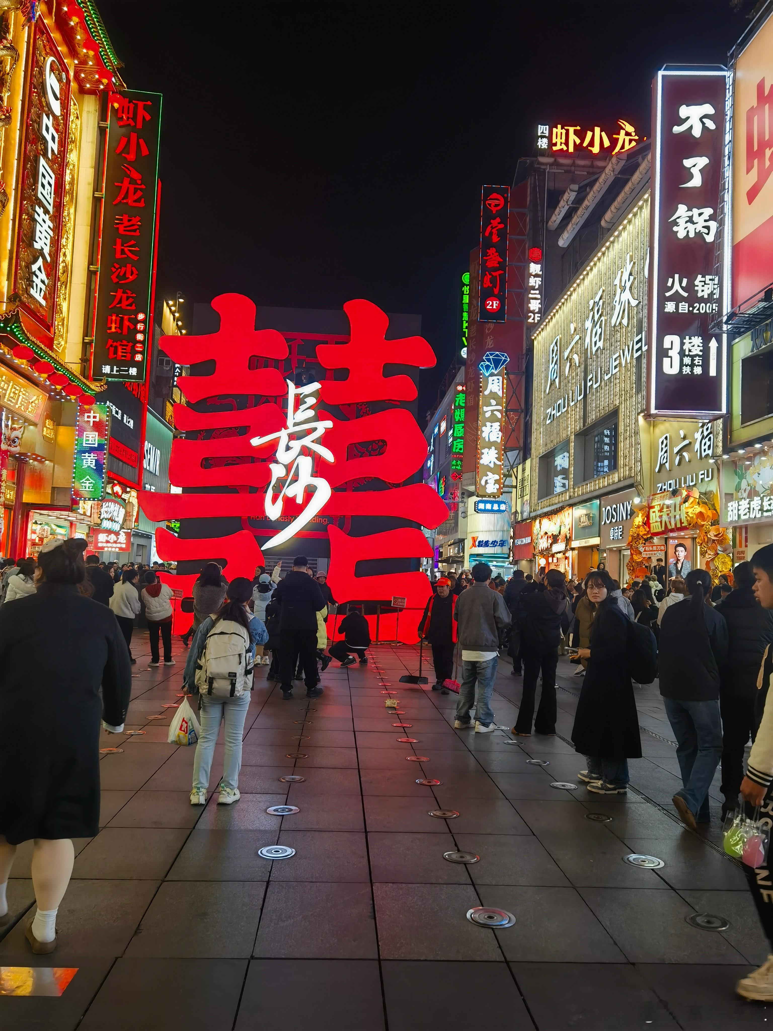 夜游黄兴步行街客有问:“星城乐土在何方?”予拊掌笑曰:“且随灯火去。”暮色初合时