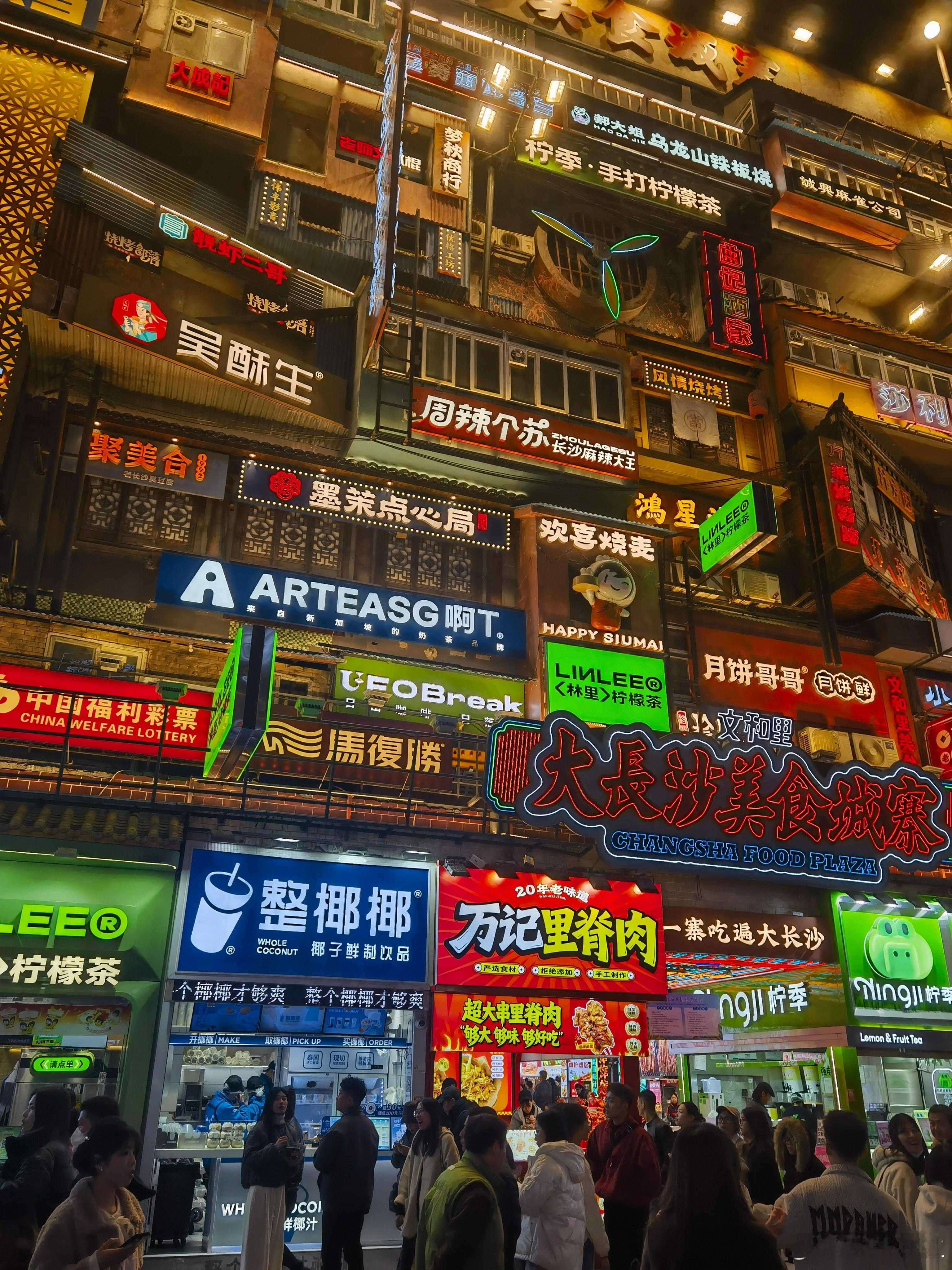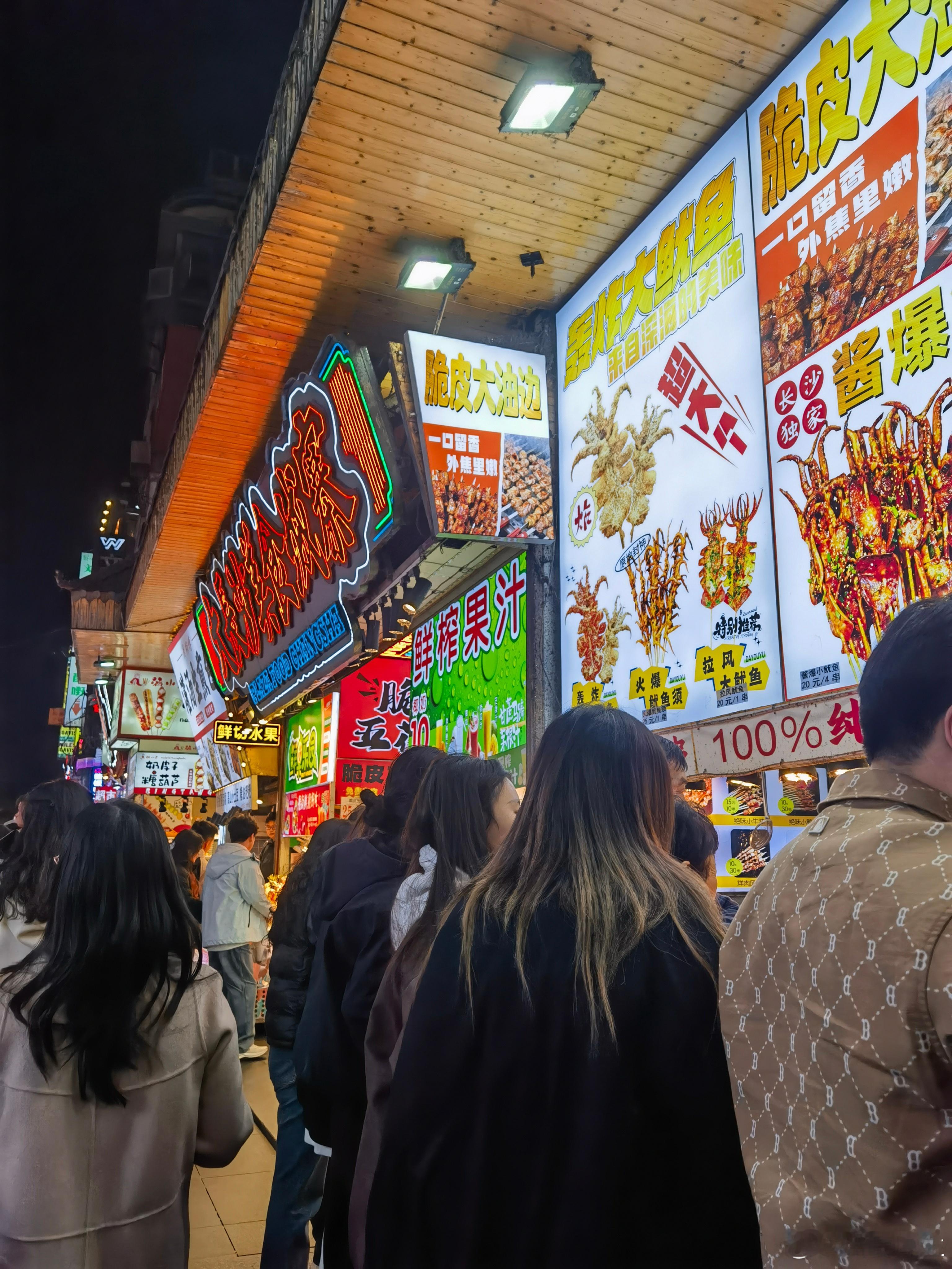 夜游黄兴步行街客有问:“星城乐土在何方?”予拊掌笑曰:“且随灯火去。”暮色初合时,踏碎一街霓虹,但见万姓游冶,呵气成云。茶颜悦色檐下,碧玉年华堆雪;文和友巷陌间,银丝老叟扶杖。最是食香勾留处:黑色经典鼎镬沸然,金甲臭豆腐裂帛声里透椒芳;辣酱板鸭赤霞凝霜,荆楚风味化作齿间雷火。美食城寨旌旗招摇,铁板烧迸射星雨,钵钵鸡荡漾春波,糯米酒浮沉月魄。忽见碧眼郎君持鱿鱼串,琥珀酱汁沾虬髯,竟与湘音老饕相视而笑。观此太平气象,恰似宋代元祐年间汴京夜市。虽无金明池水殿,然此间烟火暖人肠,稚子吮糖画,少妇试花钿,皆在琉璃灯火中漾成涟漪。归作小诗云:“十里笙歌接地灵,九霄星月让华灯。人间至味非龙髓,一串椒香慰客情。”