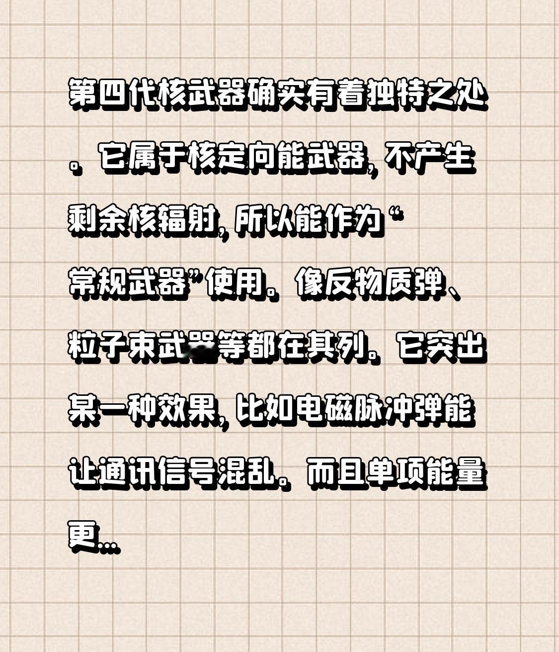 第四代核武器确实有着独特之处。它属于核定向能武器,不产生剩余核辐射,所以能作为“常规武器”使用。像反物质弹、粒子束武器等都在其列。 它突出某一种效果,比如电磁脉冲弹能让通讯信号混乱。而且单项能量更集中,有可控制的特殊杀伤破坏作用。就拿核同质异能素来说,能量量级约为2GJ/g,比高能炸药大100万倍,核裂反应能量更是高达80GJ/g。美、法等国正在研究,它还能身兼两任,在常规和核武领域都有潜力。不过其研究也引发担忧,希望能在和平框架下发展。