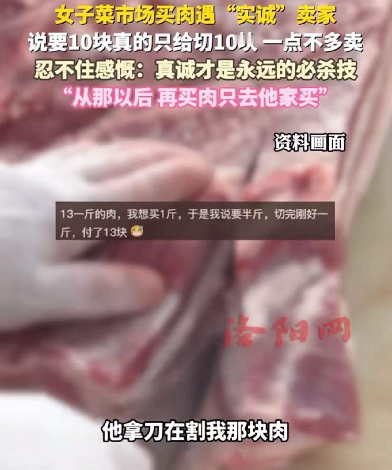 湖南,女子去买肉,提前说好买 10 块,但卖肉的大妈都会给她切 18 块甚至 20 块的肉。女子脸皮薄,大妈又说切下来之后就不好卖了,女子就只能认了!直到女子有一天换了一家卖肉的档口,忍不住感叹:真诚才是永远的必杀技! 湖南,这座古老而又充满活力的城市,藏着无数温暖人心的小故事。而今天这个故事,或许会让你重新思考“信任”的力量,也许还能唤起你心底那份对真诚的向往。 故事的女主角,是一位普通的城市居民。每天忙碌奔波之余,她最期待的,或许就是那份简单的放心——在市场里买到自己心仪的肉。她提前告诉卖肉的大妈:“我只要10块钱的份量。”看似普通的请求,却在这个市场的小摊上演出了一幕温馨的“默契”。 每次买肉,大妈总会多切几块,甚至达到了18、20块,理由简单:“切少了不好卖啊。”这句话听似普通,却折射出一份难得的善意。大妈的“多切”不是贪心,而是一份用心经营的善意,是对顾客的尊重与信任。女孩子脸皮薄,心里明白大妈的难处,却又不好多说什么,只能一遍遍“认了”。 然而,事情总在不经意间发生转变。有一天,她换了家新摊位,心怀期待又略带点犹豫。那家卖肉的小店,老板娘笑容真诚,话语朴实:“你只要10块的,我就给你切10块,绝不多也不少。”那一刻,女孩子心头一震,似乎一股暖流涌上心头。 这不仅仅是因为“少了几块肉”那么简单,更因为这份真诚打破了她心中对“交易”的刻板印象。她开始思索:在这个快节奏、功利的社会,似乎“真诚”已变得稀缺。我们习惯了算计、利益的博弈,却忽略了人与人之间最基础的信任。 这个故事让我联想到,或许我们每个人心底都渴望那份纯粹的善意。无论是在市场的摊位上,还是在职场、家庭中,“真诚”才是最永恒的“杀手锏”。它能化解误会,赢得信任,更能让人心灵得到慰藉。 试想一下,当我们在生活中多一些真诚,少一些算计,会不会让这个世界变得更加温暖?当我们愿意相信别人,也愿意用真心去对待身边的人,或许我们都能成为那份“善意的传递者”。 这个故事,或许只是一段普通的市场小插曲,但它背后的深意,却值得我们每个人深思。我们都在追求什么?是利益的最大化,还是心灵的满足?也许,答案就藏在那份“真诚”的简单里。 所以,下次当你面对一个需要信任的人时,不妨多一份善意,多一份真诚。也许,这会成为你生活中最强大的“武器”。因为,唯有真诚,才能在纷繁复杂的社会中,赢得最纯粹的信任与温暖。大婶买肉 买肉女孩 买肉小诀窍 买肉小姑娘 湖南大块肉