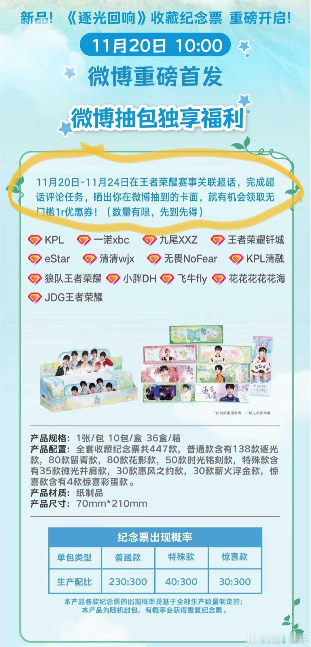 KPL《逐光回响》收藏纪念票来咯点上面链接可以直接抽。抽之前可以在评论区互动一下,有机会得到满10减1券。