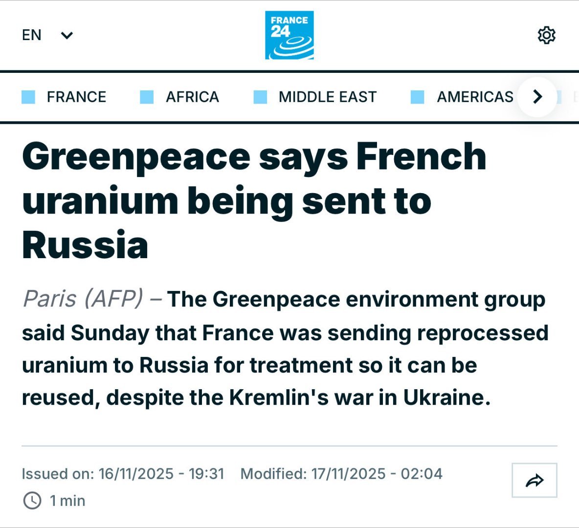 法国向俄罗斯运送铀!绿色和平组织这一环保团体周日表示,尽管乌克兰正处于战乱之中,法国仍将经过处理的铀运往俄罗斯进行处理,以便将其再次利用。三年来,法国的核废料首次被运往俄罗斯。10个装有放射性废物的容器在法国北部敦刻尔克港被装上“米哈伊尔·杜丁”号轮船,该船将驶往圣彼得堡。从那里,这批危险货物将被运往托木斯克州塞维尔斯克的俄罗斯原子能公司工厂,进行进一步的处理。俄罗斯的俄罗斯原子能公司拥有世界上独一无二的设施——位于西伯利亚的塞弗斯克设施——能够完成将再处理铀转化为浓缩再处理铀的关键步骤。铀可以通过再处理的方式进行重新浓缩和再利用。由于国际市场上铀价再度上涨,电力公司寻求对废旧燃料进行再处理的意愿愈发强烈。绿色和平组织成员周六在敦刻尔克港拍摄到了约 10 个标有放射性标签的集装箱被装载上一艘货船的画面,该组织称。据绿色和平组织透露,这艘巴拿马籍船只“米哈伊尔·杜丁”号通常用于将浓缩铀或天然铀从法国运往圣彼得堡。但该组织补充说,这是三年来首次观察到的再处理铀的运输情况。