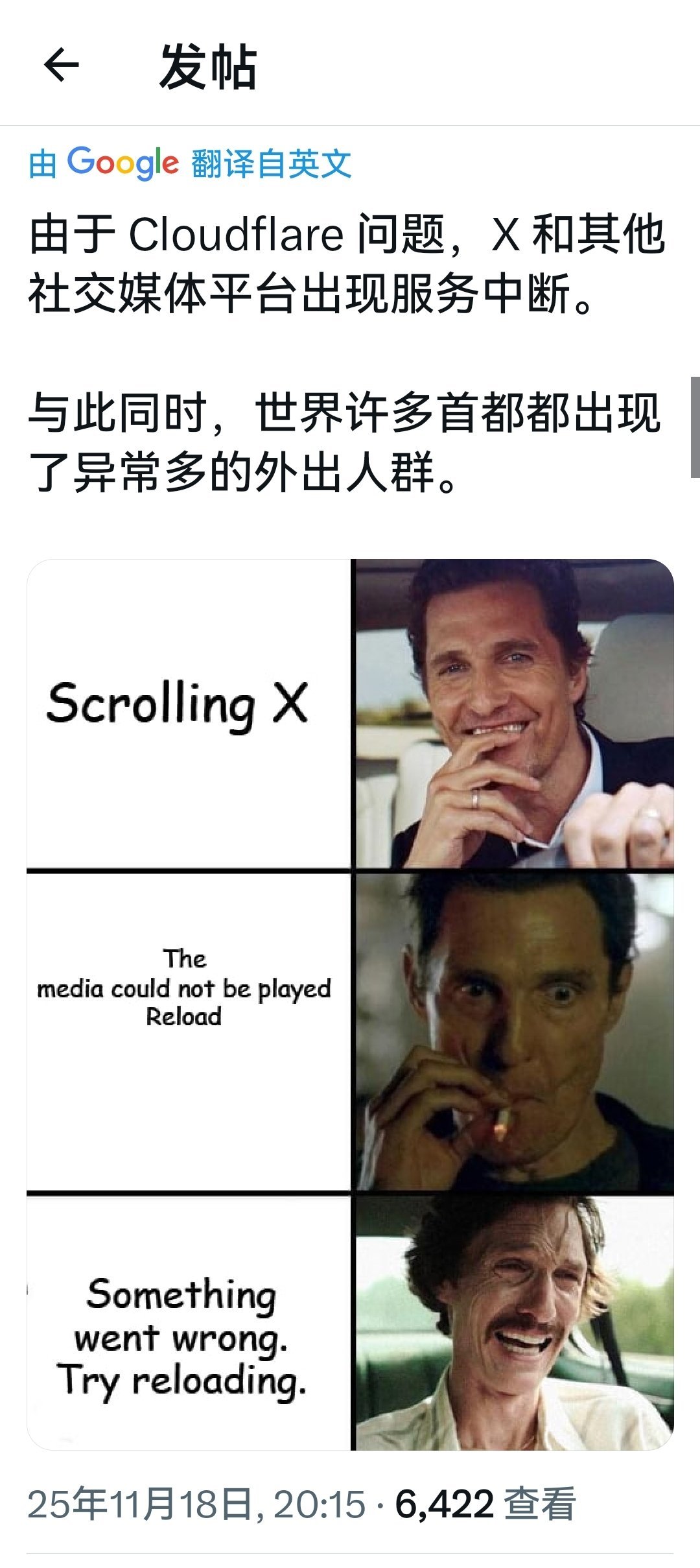 由于 Cloudflare 出现故障,X 及其他社交媒体平台均出现服务中断的情况。