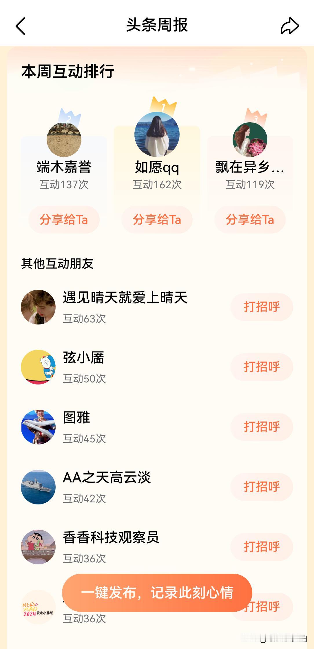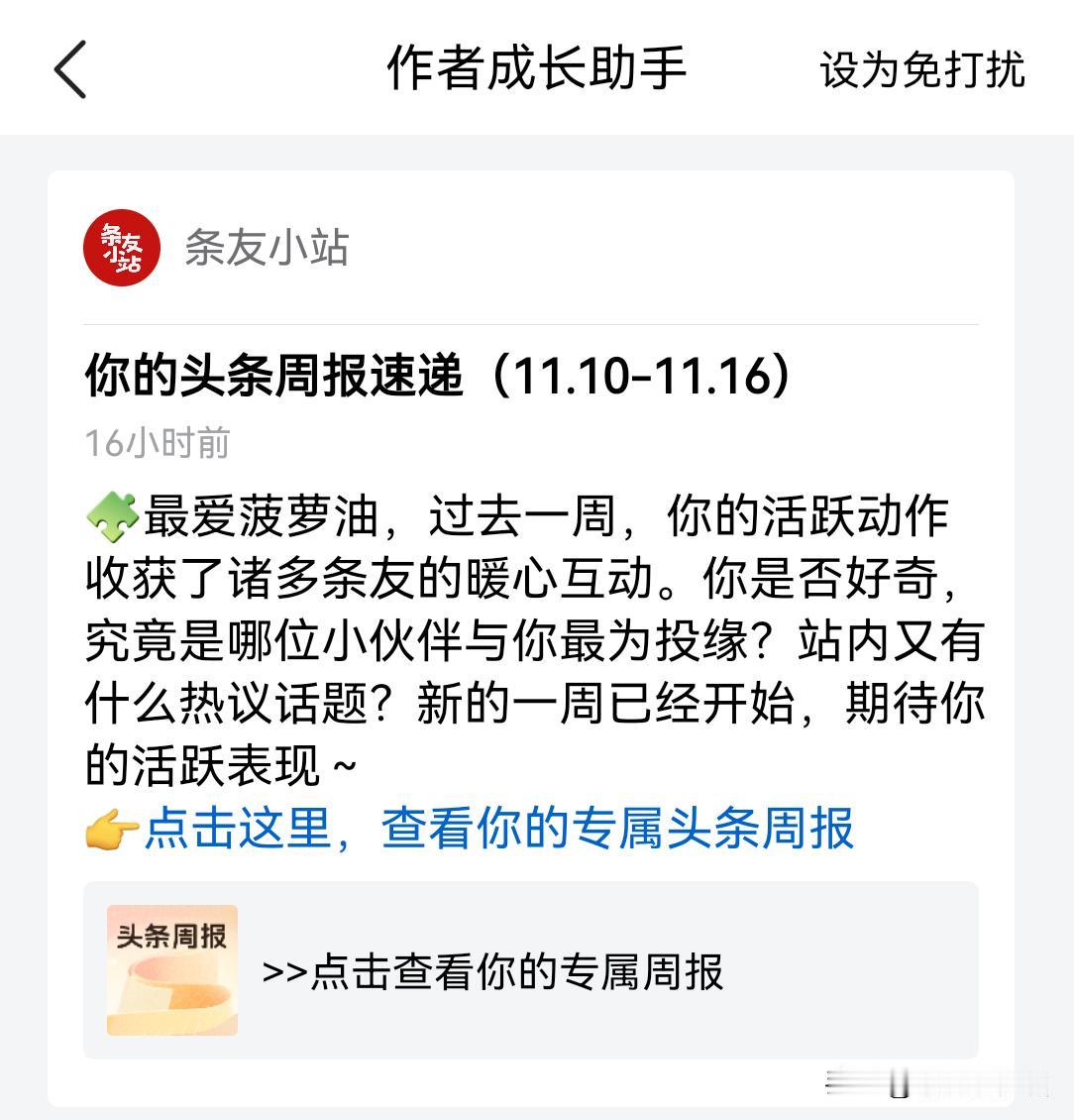 我的头条周报来啦! 早上收到条友小站发来消息: 你的头条周报速递(11.10-11.16) 最爱菠萝油,过去一周,你的活跃动作收获了诸多条友的暖心互动。你是否好奇,究竟是哪位小伙伴与你最为投缘?站内又有什么热议话题?新的一周已经开始,期待你的活跃表现~ 点开一看,榜单立刻呈现眼前。 感谢@如愿qq 互动162次,@端木嘉誉 互动137次,@飘在异乡的追梦人 互动119次,@遇见晴天就爱上晴天 互动63次,@弦小靥 互动50次,@图雅 互动45次,@AA之天高云淡 互动42次,@香香科技观察员 互动36次,@爱吃小胖纸 互动36次……还有许多没有在榜单上的小伙伴们!感谢你们的真诚互动,有你们真好! [加油][作揖][加一][赞][比心][祝福][耶][机智]