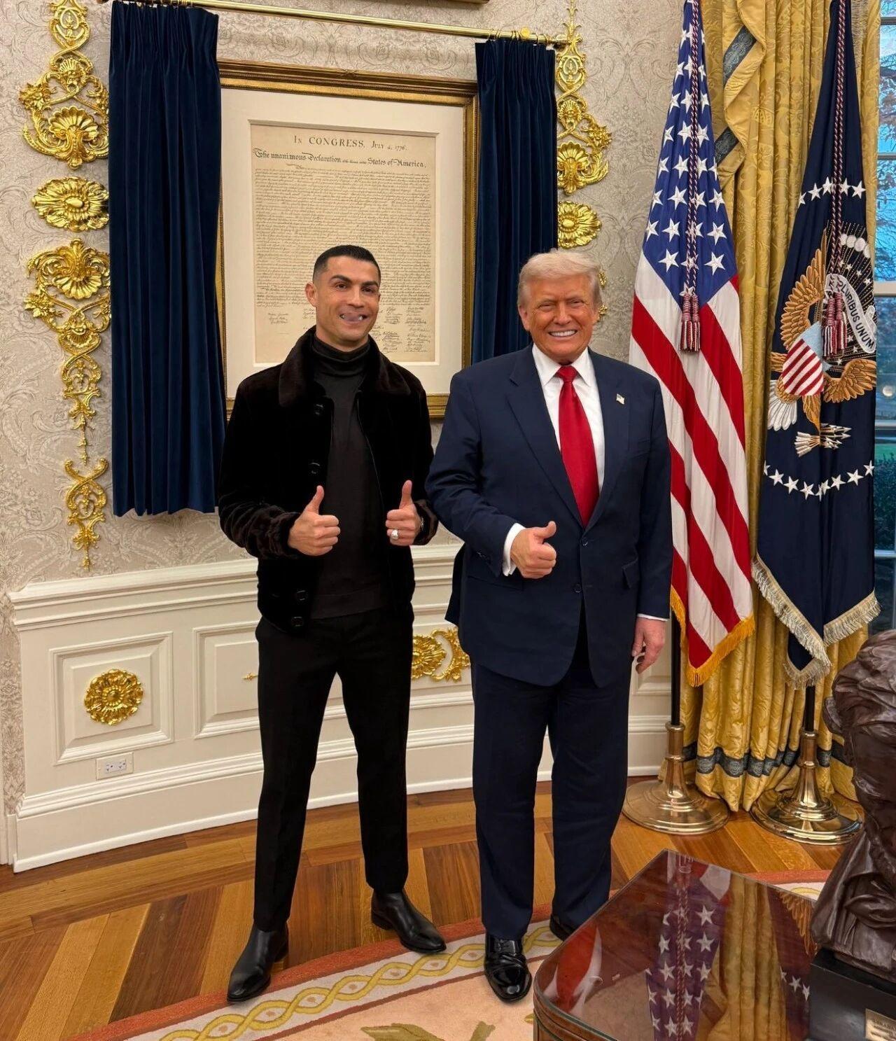 一张最有权势人的自拍照风靡网络,克里斯蒂亚诺·罗纳尔多(C罗)携伴侣及其他几位世界级权势人物抵达白宫,与唐纳德·特朗普会面。除了会后发表的声明之外,罗纳尔多本人还拍摄了一张自拍照,瞬间引爆网络。这张照片与埃隆·马斯克和其他几位世界富豪的合影,在网络上迅速走红。除了埃隆·马斯克之外,照片中还有身价约33亿美元的美国商务部长霍华德·卢西克及其妻子艾莉森、国际足联主席詹尼·因凡蒂诺 ,当然还有C罗本人。照片发布几分钟后,就被誉为“自2014年以来最火爆的自拍”,指的是当年奥斯卡颁奖典礼上艾伦·德杰尼勒斯与好莱坞所有巨星的合影,那张照片曾轰动网络。C罗出席特朗普欢迎沙特王储宴会时,身着黑色燕尾服,与马斯克和副总统J·D·万斯并肩而坐。出席的还有小唐纳德·特朗普、国务卿马可·卢比奥、众议院议长迈克·约翰逊和苹果公司首席执行官蒂姆·库克。特朗普对罗纳尔多赞不绝口,说道:“这间屋子里都是世界顶尖的领袖,来自商界、体育界……我的儿子是罗纳尔多(C罗)的忠实粉丝……“巴伦有机会见到了他,我想,仅仅因为我认识了你,他现在就更加敬重他的父亲了,在他看来,这是我迄今为止最大的成就。”来源:影像中的英国