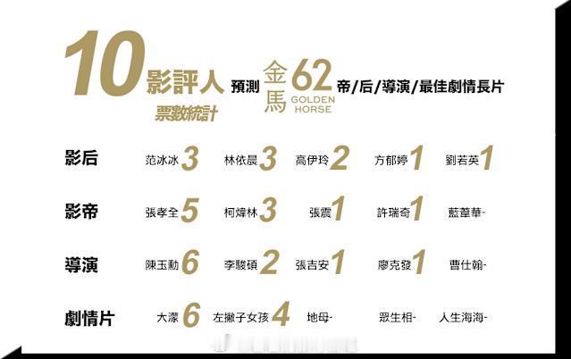金马影帝影后超前预测。第62届金马奖即将于本周六公布获奖名单, Yahoo电影戏剧编辑部号召十位影评人共同看完入围组电影作品,并做出预测性投票。