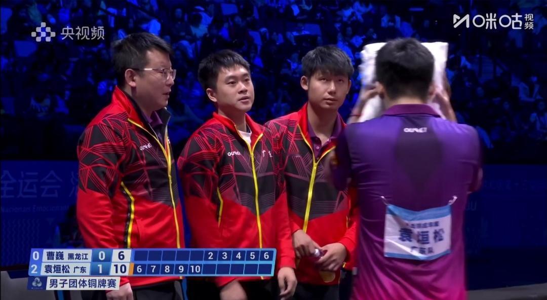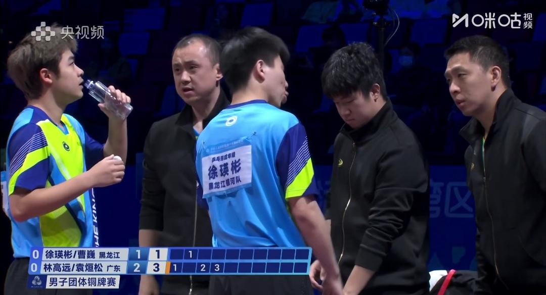 乒乓球广东男队少了樊振东,全运会奖牌由金变铜了! 10:00 全运会乒乓球成年组男子团体赛准开始3、4名决赛始。 全运会乒乓球成年组铜牌争夺战,广东队3:0完胜黑龙江队。 第一盘:林高远/袁烜松3:1(9-11;11-9;11-4;11-4)逆转胜徐瑛彬/曹巍。 第二盘:周启豪3:1(11-7;11-4;8-11;11-9)胜魏世浩。 第三盘:袁烜松3:0(13-11;12-10;11-6)胜曹巍。 广东队一点也不给国乒“内战王”黑龙江队徐瑛彬单打的机会! 2021全运会,拥有金满贯的小胖樊振东的广东队(樊振东,林高远,周启豪)与北京队(马龙,王楚钦,闫安)男团争冠,小胖一人独得两分夺得全运会男团冠军! 如今广东队少了小胖,实力大减,奖牌颜色也由金变铜了!
