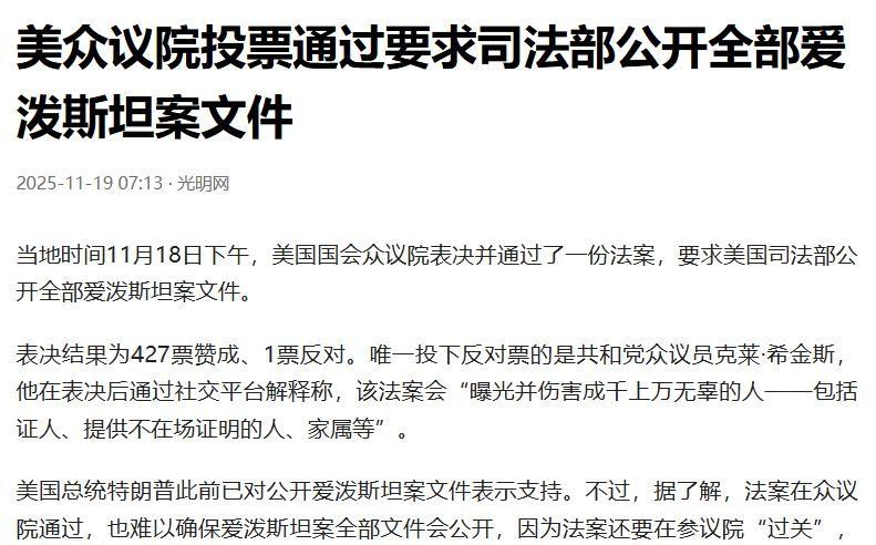 爱泼斯坦档案:一场遮遮掩掩的政治游戏 爱泼斯坦案的档案,尘封已久,关系复杂,涉及许多权贵,一直被捂着,特朗普上台后,好像一开始也不想公开,后来态度变了,这就奇怪了,民主党肯定想借这个事搞他,共和党内部也有矛盾,一派想清算那些老家伙,国会这次居然意见一致了,427比1,通过了那个透明法案,这可不常见,特朗普怎么突然同意公开了呢,很多人都在猜,是不是有什么内幕消息。 可能是他之前的一些邮件被扒出来了,对他不利,他想先下手为强,主动公开一些东西,转移视线,但是大家觉得他就是投机,想把自己摘干净,司法部手里还攥着最终的权力,可以遮蔽关键信息,说是为了保护隐私和安全,谁知道呢,这个档案牵扯的人太多了,真公开了,估计要出大事,大家都在争夺档案的控制权,背后就是利益,利益的重新分配。 看起来好像要真相大白了,实际上呢,还不是权力斗争,公众想知道真相,但是真相可能被当成交易的筹码,这就是美国政治的本质吧,利益平衡,权谋算计,所谓的透明,可能只是个幌子,大家看完这个之后,是不是觉得有点讽刺。