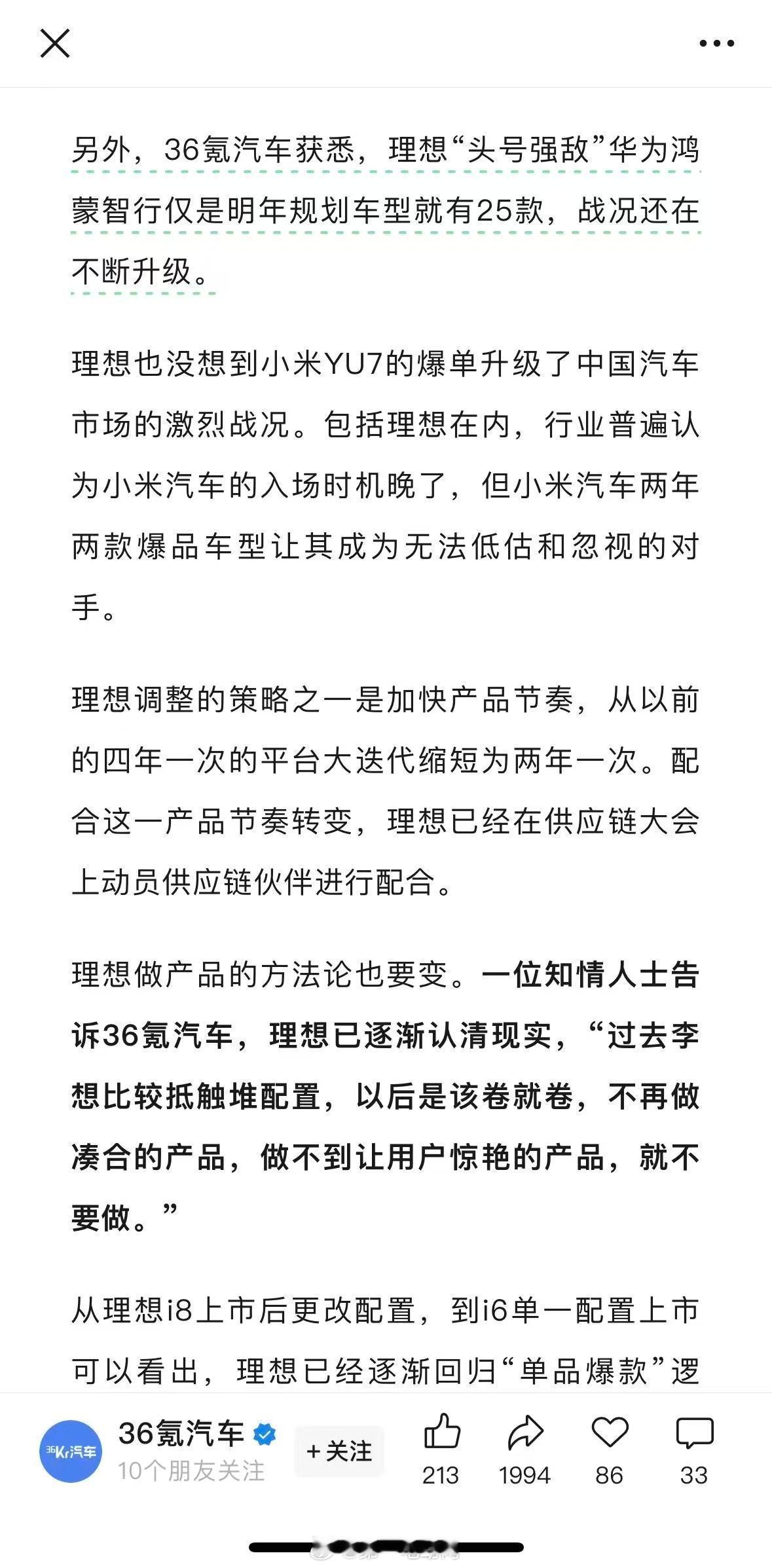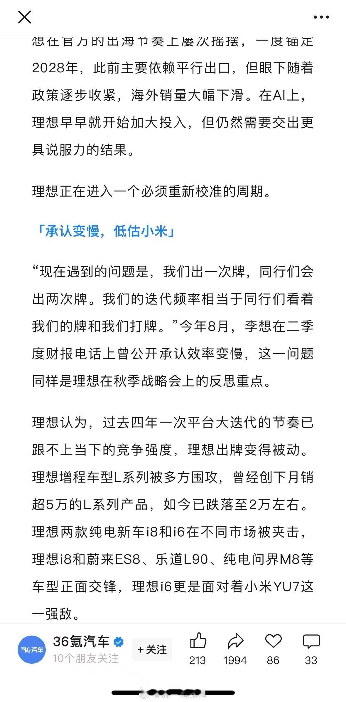 36氪汽车报道了理想汽车10月开完一场“反思大会”,承认自己“出牌太慢”,甚至低估了小米这样的对手。李想之前有个很形象的比喻:“我们出一次牌,同行们会出两次牌。”过去“四年一次”的平台大迭代节奏完全跟不上现在“半年改款,一年换代”的市场速度了。现在决定把周期缩短到两年,并且动员供应链一起配合。未来车型要打破家族化“套娃”设计,靠设计定义来区分,不同车型外观会有差异化。从过去李想“抵触堆配置”,转变为 “该卷就卷” ,追求让用户惊艳的产品,回归“单品爆款”逻辑。反思“最大的失误是全力出海晚了”。之前严重依赖平行出口,接下来要全面加快官方出海节奏,重点拓展中东、中亚及欧洲市场。每月在算力上投入超1亿元,第二代自研芯片将更侧重推理能力,预计两年后推出。面对销量下滑和激烈竞争,理想汽车正在进行一场从产品、研发到出海、AI技术的全面战略调整,试图重新找回节奏。