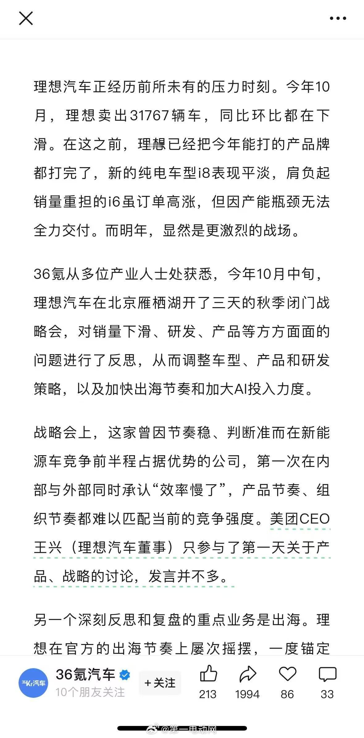 36氪汽车报道了理想汽车10月开完一场“反思大会”,承认自己“出牌太慢”,甚至低
