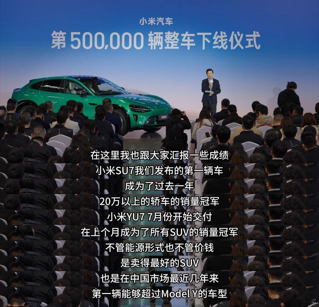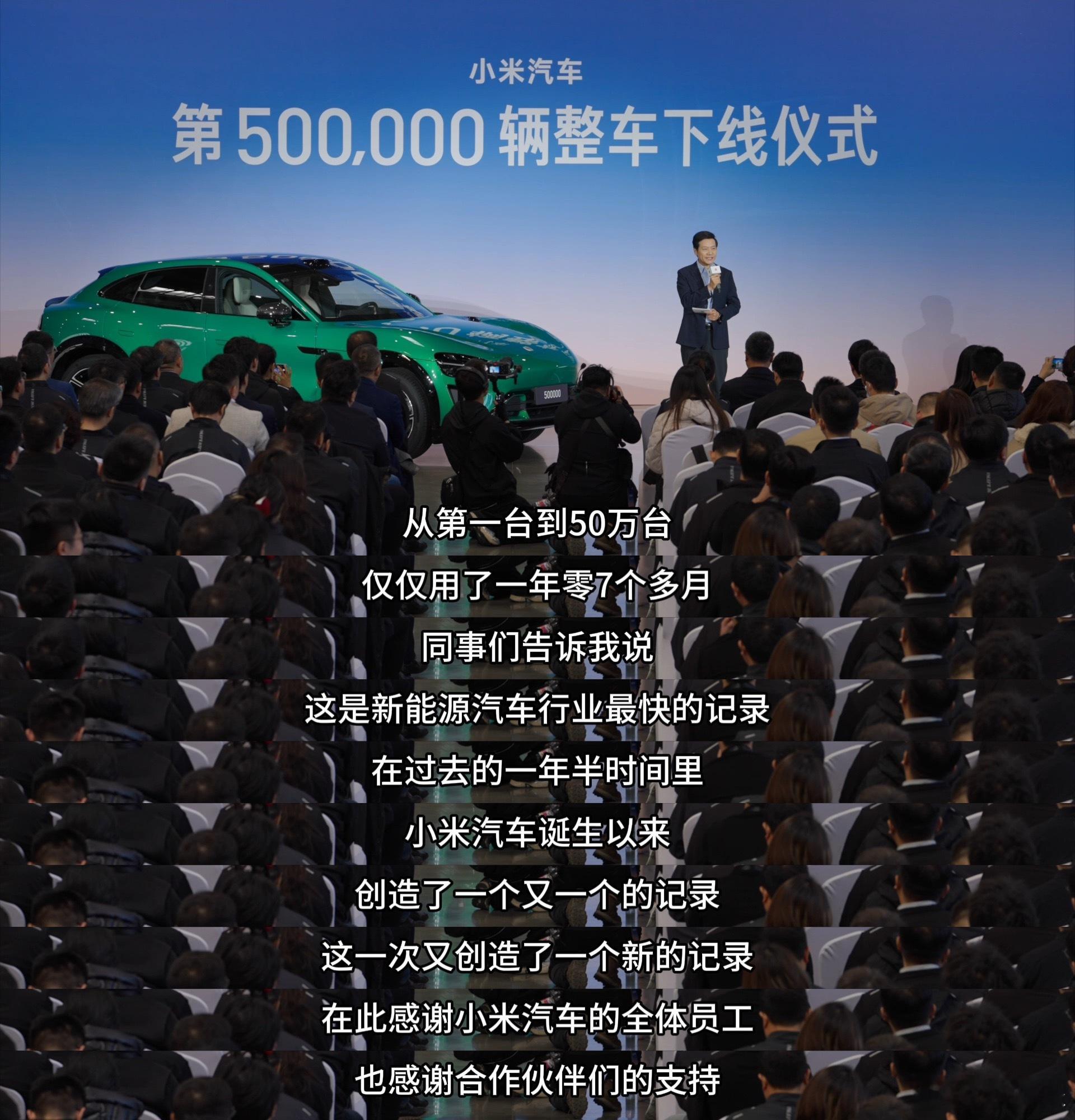 今天,小米第50万辆车下线,再次刷新新能源汽车行业记录。小米汽车之所以能取得这样的成绩,核心就在一起赢和安全是基础是一切的理念。先说一起赢,当一些车企还在压供应商利润时,小米已经把供应商当合伙人。甚至有不少合作伙伴说,搭上小米汽车这趟快车后,公司的技术和产能都升了一大截,这就是链主企业的带动效应。而且,小米50万辆车带动的不是一家企业,而是京津冀整个新能源产业链。一个人或许可以走得很快,但一群人才能走得更远;再说安全,关于小米汽车的安全,我说过很多次了,而且47610Nm/deg车身扭转刚度、2200MPa超高强度钢、内嵌防滚架、电池包多重保护……这些在网上的拆车视频以及评测里都有印证,这也是雷总敢让大家随便点评的底气。