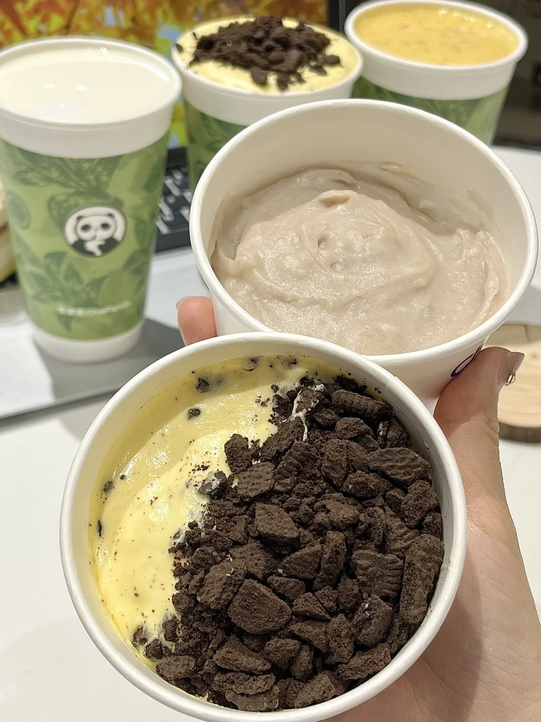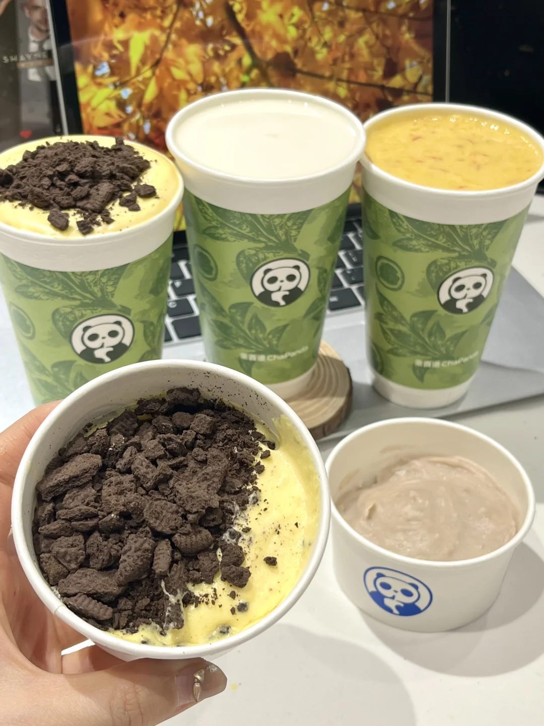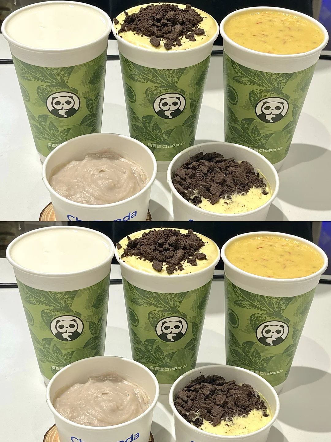 一口沦陷…我真的爱茶百道的这三杯奶茶🥹 简直是我的“冬日暖宝宝❄️”! ✔️奥利奥半熟芝士 咸咸茶茶的加上芝士绵密的口感层次无敌了!! 大口先嗦浓醇的芝士盖盖!!恰到好处的奥利奥🍪搅匀之后奥利奥香茶香咸香层层递进!好喝的有点儿过分了。。。🤤 ✔️杨枝甘露 双倍芒果🥭每口都能喝到新鲜芒果果肉,香浓的生椰乳配上一大勺糯唧唧的泰国长粒白糯米,越嚼越上头!奶茶像甜品一样好吃,求你们试试😭 ✔️超厚芋泥奶绿 降温当然是要喝厚芋泥!!芋泥香气从口腔飘香到鼻腔!!暖呼呼的😍太幸福咯!⚠️记得备注要个勺子!喝到最后有点稠可能吸不上来!