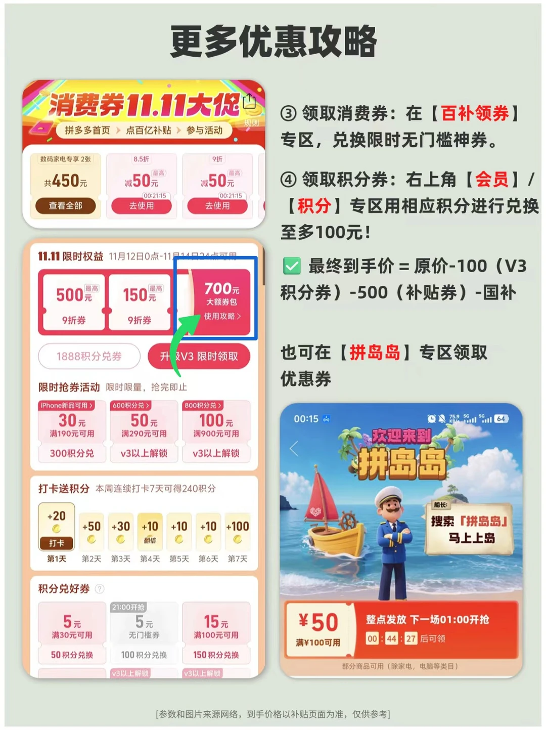 ✅ 到手价 = 原价-100(V3积分券)-500(补贴券)-国补