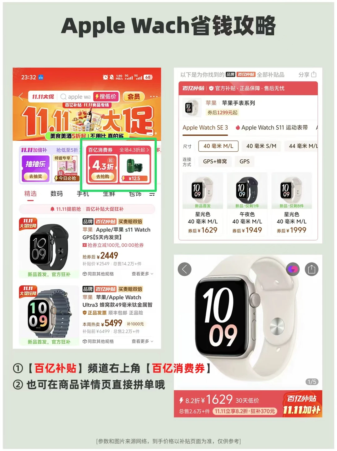 Apple Watch SE3低至1629元起,Apple Watch S11低至2449元起,Apple Watch Ultra3低至5099元起。