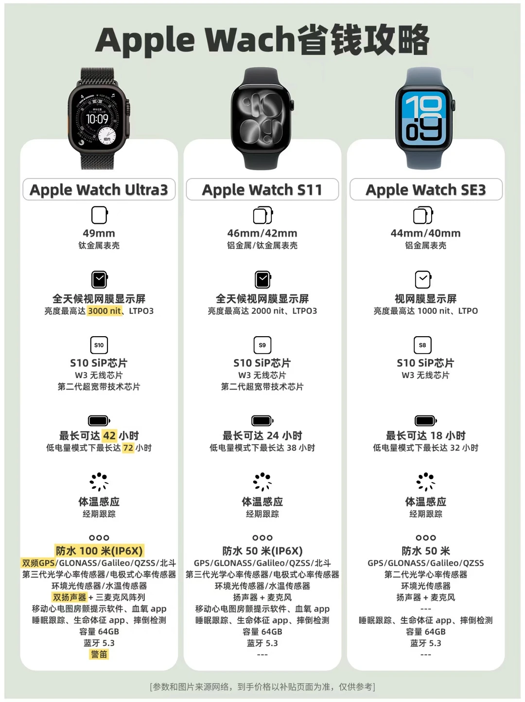 不知道Apple Watch系列的SE3、S11、Ultra3怎么选的伙伴,看这里: