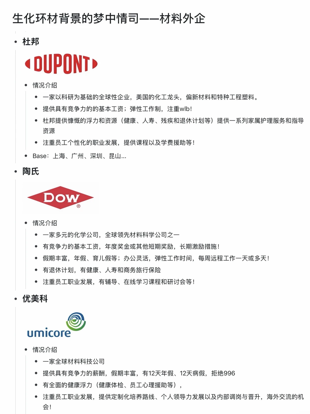 材料行业这几年一直稳步扩张,尤其是新能源、半导体、高性能材料这些赛道,投入持续加大、人才缺口非常明显。恰恰是需要生化环材这类理工科背景——专业对口、学习快、稳定性强。 · 为什么建议去材料外企? ▪️晋升路径清晰,国际视野 ▪️工作氛围好,注重wlb,很多都支持居家办公 ▪️五险一金+补充医疗,年假基本上是10天起步、圣诞假、生日假... · 坚持日更✊,帮大家在找工作路上顺利拿 offer! ·