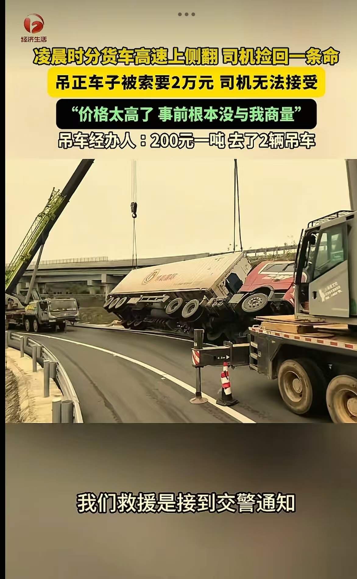 “高速翻车被索天价救援费?司机直呼“明抢”!江西抚州,货车在高速侧翻,被索要 2 万吊车费!司机:“价格太高了,事先没告知!而且这仅仅是吊正扶起的费用,运输费还需要另外算,承担不起!”吊车经办人:“交警喊我们去的,200 元一吨!” 这起高速翻车事件,原本只是一次普通的突发事故,却因为一笔天价救援费,瞬间点燃了公众的愤怒和担忧。事发在江西抚州的一条高速上,一辆货车在行驶中突然侧翻,现场一片混乱。救援人员迅速赶到,将事故车辆吊起,然而,随之而来的却是一份令人震惊的“救援费用清单”——2万元的吊车费。 司机当场就觉得“明抢”,他坦言:“价格太高了,事先根本没有告诉我这个费用。”更让人气愤的是,这个价格看似“标准收费”,但实际上,吊车经办人透露:“交警叫我们去的,200 元一吨。”这意味着,吊车费是按吨位计算,而这个“天价”费用,远远超出了司机的预期和承受范围。 这起事件暴露出的问题,远不止一个“收费过高”的个案。它反映出在应急救援中,部分企业或个人借机牟取暴利,严重损害了普通司机的权益,也让公众对交通救援体系的公平性产生质疑。更有意思的是,救援收费的“透明度”和“合理性”成了公众热议的焦点——为什么事先没有明确告知?为什么没有统一的收费标准?难道在紧急时刻,救援就变成了“明抢”? 这也引发了我们对“应急救援”行业的深层次思考。救援本应是“救人于危难”,而非“救人于利益”。在法律层面,是否应该制定更为明确和严格的收费标准?在执行层面,是否应该在事故发生前,向司机提供明确的收费告知?在公众心中,救援的“公平”和“透明”才是最基本的底线。 更令人担忧的是,这样的事件会不会成为一种“潜规则”,让一些机构借助紧急情况“随意涨价”?如果没有有效的监管和惩治机制,普通司机的权益又该如何保障?我们不得不问:这样的“明抢”现象,究竟还会持续多久?而作为公众,我们又该如何防范类似的“陷阱”? 此时此刻,我们更需要的是制度的完善和行业的自律。事故发生的那一刻,救援人员和企业的职责应当是“救人”,而非“谋利”。我们呼吁相关部门加强监管,制定合理的收费标准,让每一位在危难时刻伸出援手的救援机构,都能用行动赢得公众的信任。 人生在世,谁都不愿遇到突如其来的事故,更不愿成为“天价救援费”的受害者。希望通过这次事件,能唤起更多人的关注和讨论,让我们的交通环境变得更加公平、透明,也让那些“明抢”行为无处遁形。毕竟,真正的救援,是在危难之际的那份温暖与责任,而不是一场“价格战”。高速塌陷事故 高速救援乱收费 高速救车 侧翻救援 高速救援陷阱 高速拖车救援 江西高速事故