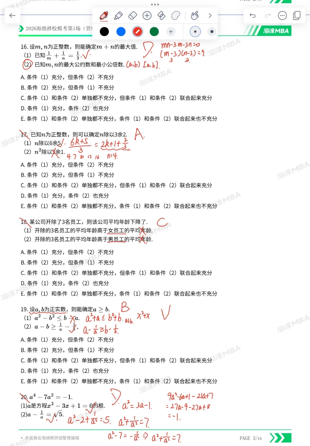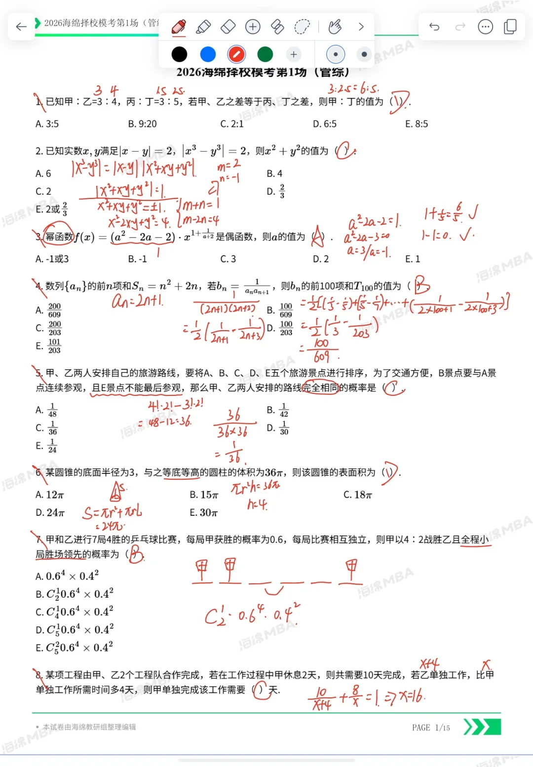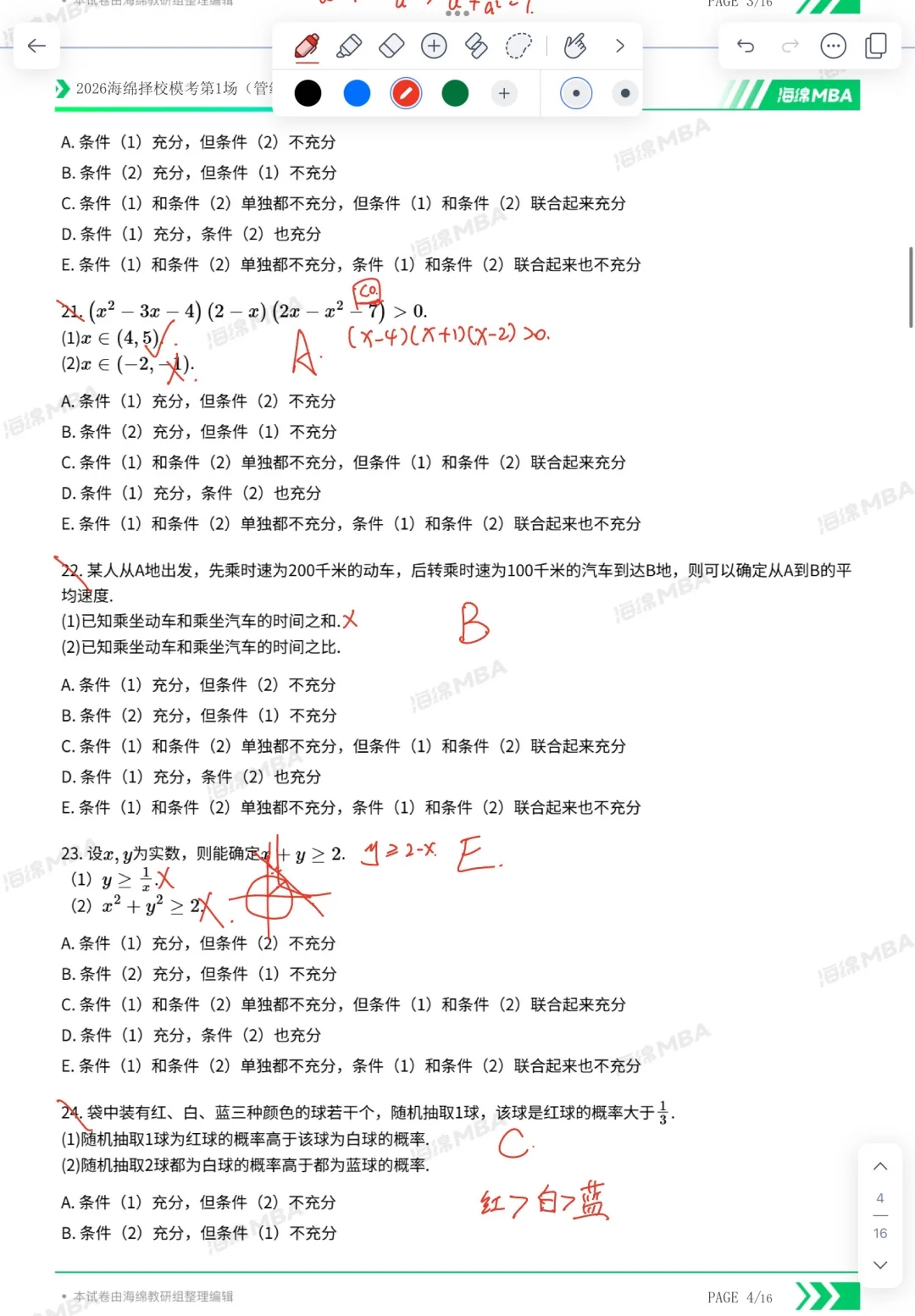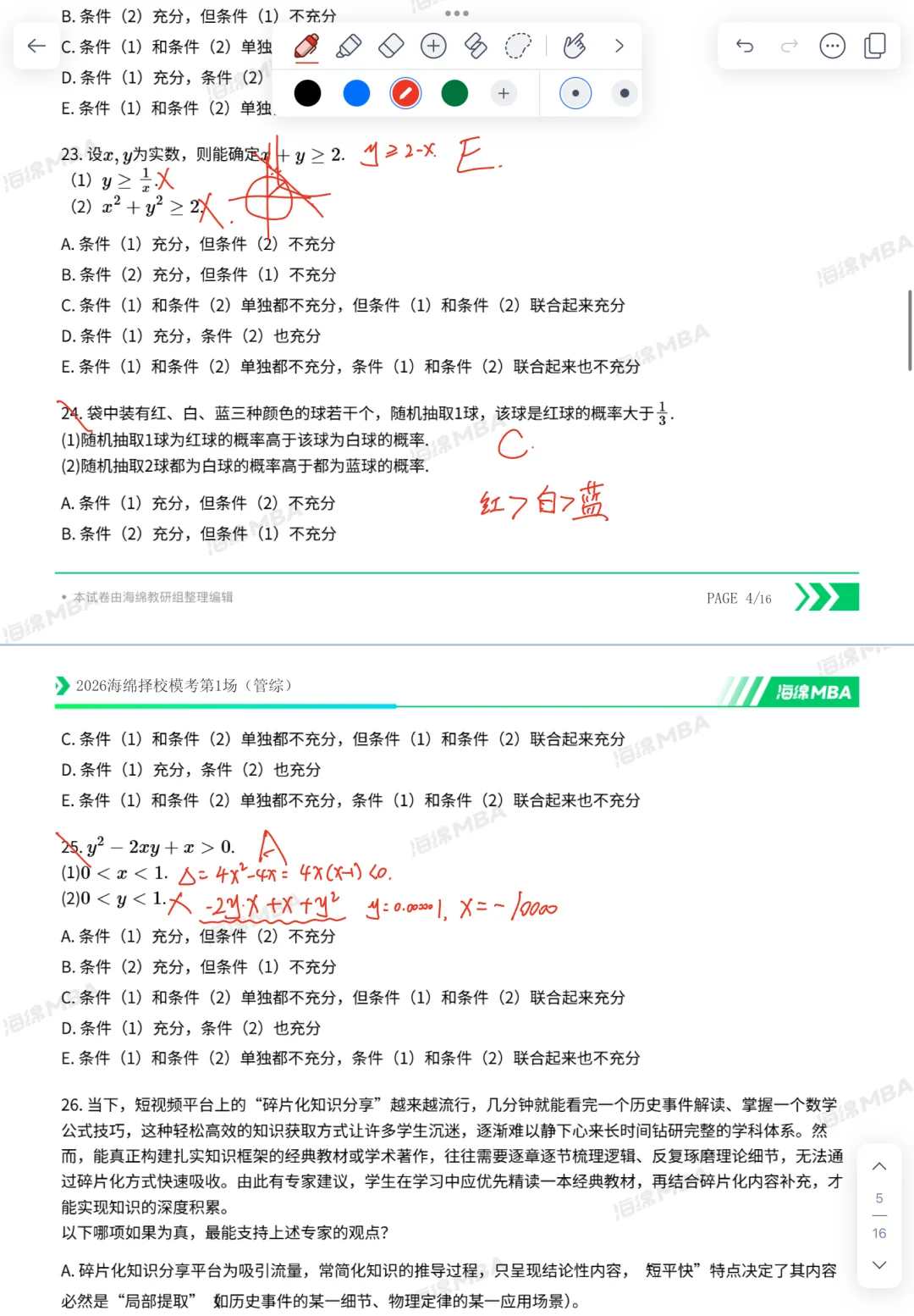 整体来说数学难度大于24真题小于25真题,逻辑较难,我自己带的学生和我了解的学生,逻辑学的很好的也错5个。 鉴于很多人都是刚开始做模考,这套试卷不客气的说,能考110以上基本211都没啥问题,115以上的话努努力可以冲一下985。 大家先看一下我的做题过程和我写的解析哈,过会会把文字版思路解析发出来。