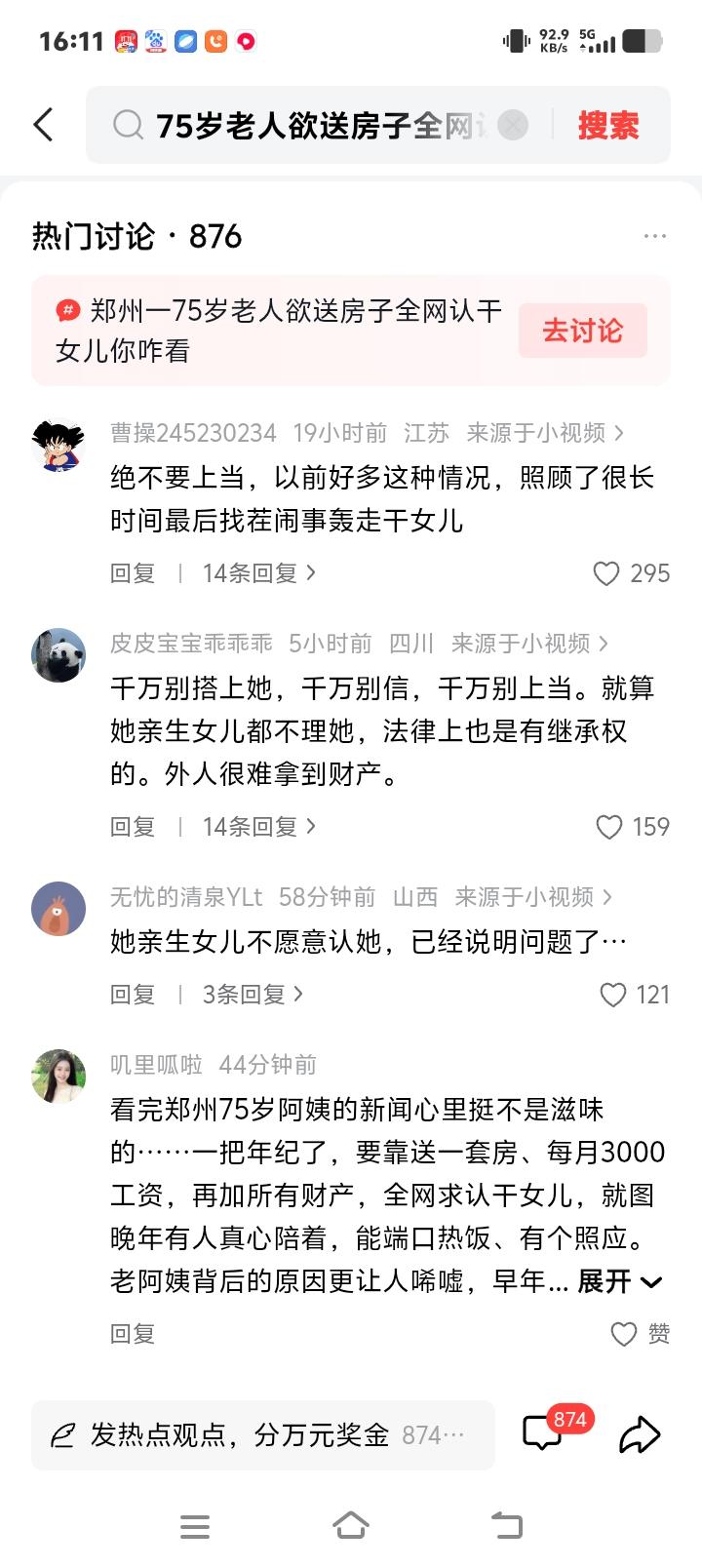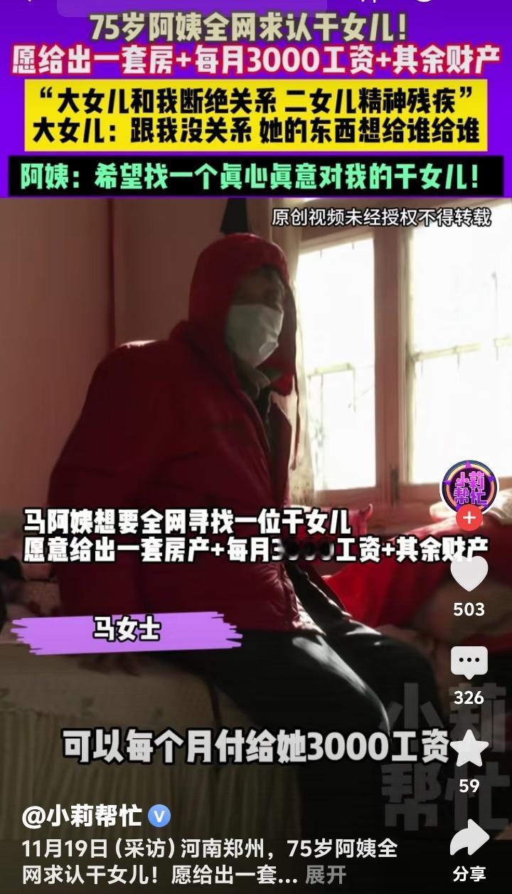75岁河南郑州阿姨倾尽家产寻暖心干女儿!一套房月薪三千加全部遗产背后藏着怎样的孤独与无奈?全网热议亲情与金钱的终极考验 (来源:纵览新闻、大参考、观威海等综合整理 深秋的河南郑州街头,一位白发老人颤巍巍举着手机录制视频,声音里带着哽咽:“我只想找个知冷知热的闺女,陪我说说话……”75岁的马阿姨或许从未想过,自己会用一套房产、每月3000元工资和全部积蓄作筹码,在茫茫人海中打捞一丝温暖。而亲生女儿那句“她的东西想给谁给谁”,像一记闷锤敲碎了血缘最后的体面。 亲情断崖背后是两代人的沉默战争 邻居们提起马阿姨总摇头叹息:“年轻时守寡带大两个女儿,大女儿远嫁后鲜少回家,二女儿因精神疾病需要长期服药。”社区志愿者透露,老人曾因帮忙照顾外孙女的方式与女儿产生矛盾,积怨如雪球越滚越大。那些深夜独自擦拭照片的时刻,那些节假日冷清的饭桌,都在无声诉说着中国式家庭中“爱不得”与“放不下”的纠葛。 全网寻亲引爆人性试炼场 消息一出,评论区瞬间撕裂成两个世界。有人痛心疾呼“别被房产蒙蔽双眼”,列举多起养老纠纷中“干亲变仇人”的案例;也有温柔留言“妈妈我在呢”,附上亲手织的围巾照片。更现实的声音则算起经济账:在郑州,3000月薪能否覆盖24小时陪护?房产过户会否因法定继承人反悔成一纸空文?这场寻亲早已超越个体事件,成了照见社会信任危机的棱镜。 法律天平如何称量冷暖人生 律师解读此事件时眉头紧锁:“若二女儿被认定为无民事行为能力人,其法定继承份额将受特殊保护。即便签订遗赠扶养协议,未来也可能面临亲生子女的继承权诉讼。”那些藏在《民法典》条框里的冰冷文字,此刻正与一颗渴望温暖的老人心激烈碰撞。当亲情需要合同时,我们失去的何止是信任? 千万孤独老人正在敲击时代之门 第七次人口普查数据显示,我国空巢老人已突破1.3亿。马阿姨的故事像一面镜子,映照出无数个在阳台上眺望的剪影。有社会学者犀利指出:“当养儿防老传统被城市化碾碎,当社区养老体系尚未健全,用财产置换陪伴成了最无奈的赌注。”这场个体命运的选择,实则牵动着整个社会的神经。 金钱与真心的千年命题 历史总是惊人相似。古有“彩衣娱亲”的孝道佳话,今有“房产认亲”的现实寓言。心理学专家剖析道:“老人真正渴望的不是交易式的伺候,而是被需要的情感认同。但当真心需要物质担保时,这场关系从开始就站在了悬崖边。”那些连夜赶往郑州的应征者里,又有几人能读懂老人眼底的忐忑? 破碎关系中的救赎微光 在谩骂与质疑的夹缝中,也有温暖悄然生长。32岁的幼儿园教师李雯留言:“我不要房产,周末可以去陪阿姨包饺子。”几个本地志愿者组建了“临时闺女团”,轮流上门读报聊天。这些星星之火能否燎原,取决于我们是否愿意相信:在算计与防备的时代,依然有人愿意用真诚捂热另一颗心。 每个人终将面对的岁月之问 当马阿姨颤抖的手划过手机屏幕,她寻找的或许不仅是养老保障,更是对一生付出的终极追问。有网友感慨:“今日围观阿姨的命运,何尝不是预演我们的明天?”在老龄化浪潮席卷的当下,如何让黄昏岁月不再充满算计与不安,需要每代人的共同作答。 此刻,郑州某小区亮起的灯火里,一位老人正守着电视等一个未知的来电。她不知道的是,这场寻求温暖的旅程,早已变成照见时代情感的X光片……